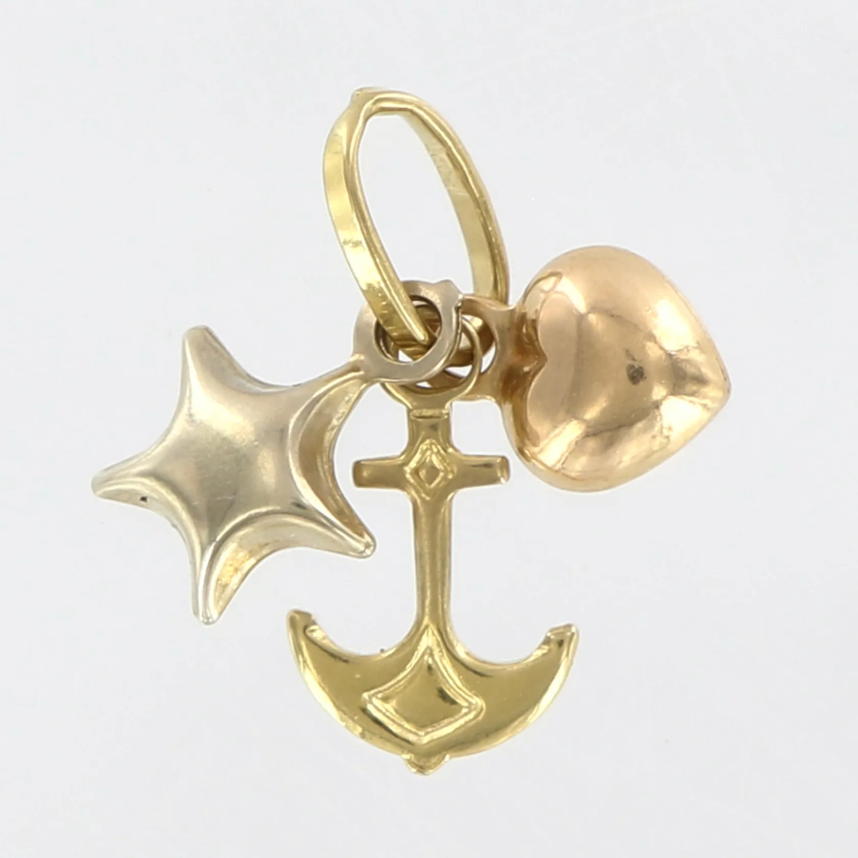 Hänge med tre berlocker, längd ca 16mm, röd/gul/vitguld, 18K Vikt: 1 g.