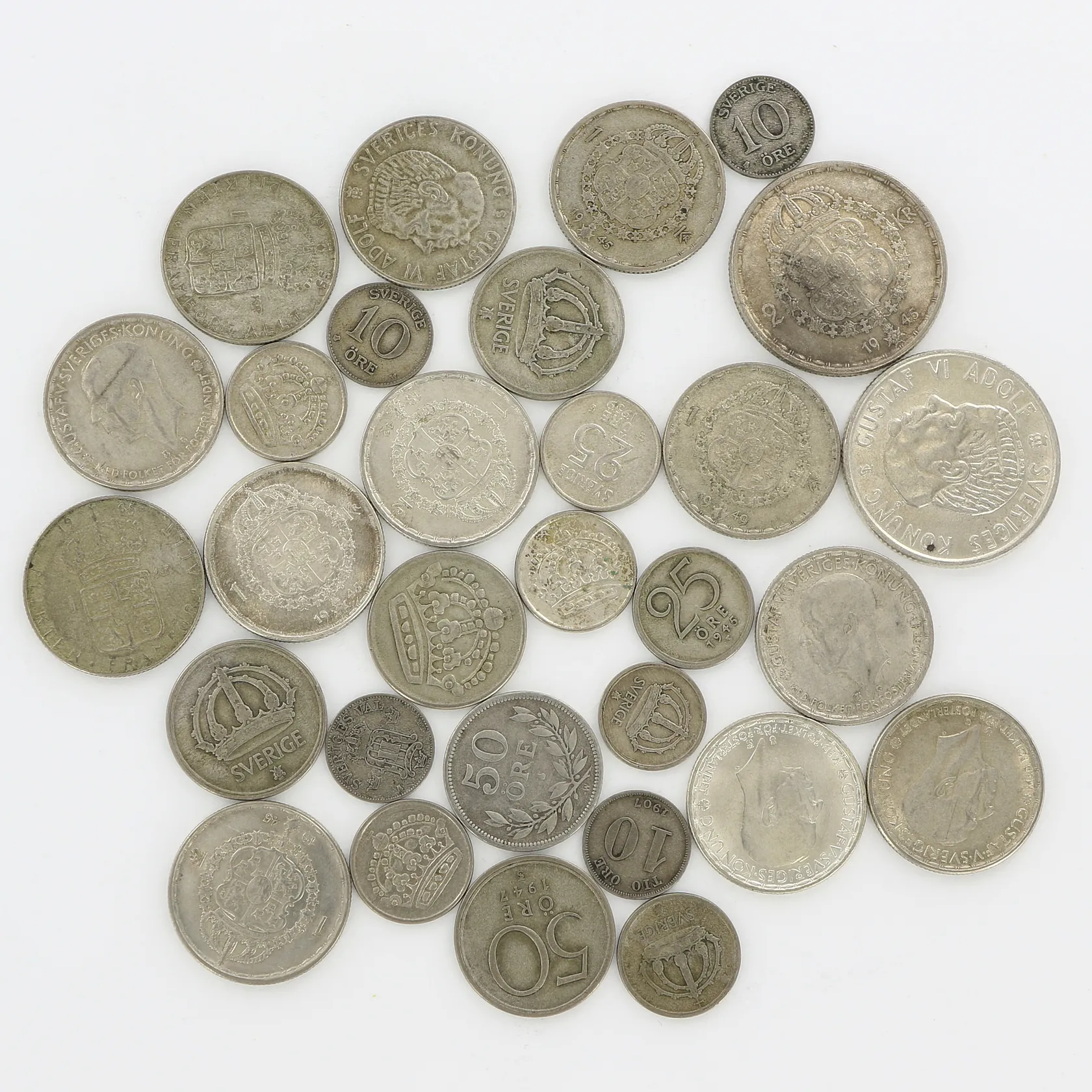 30 mynt olika valörer och årtal, silver 400/1000 Vikt: 156,5 g.