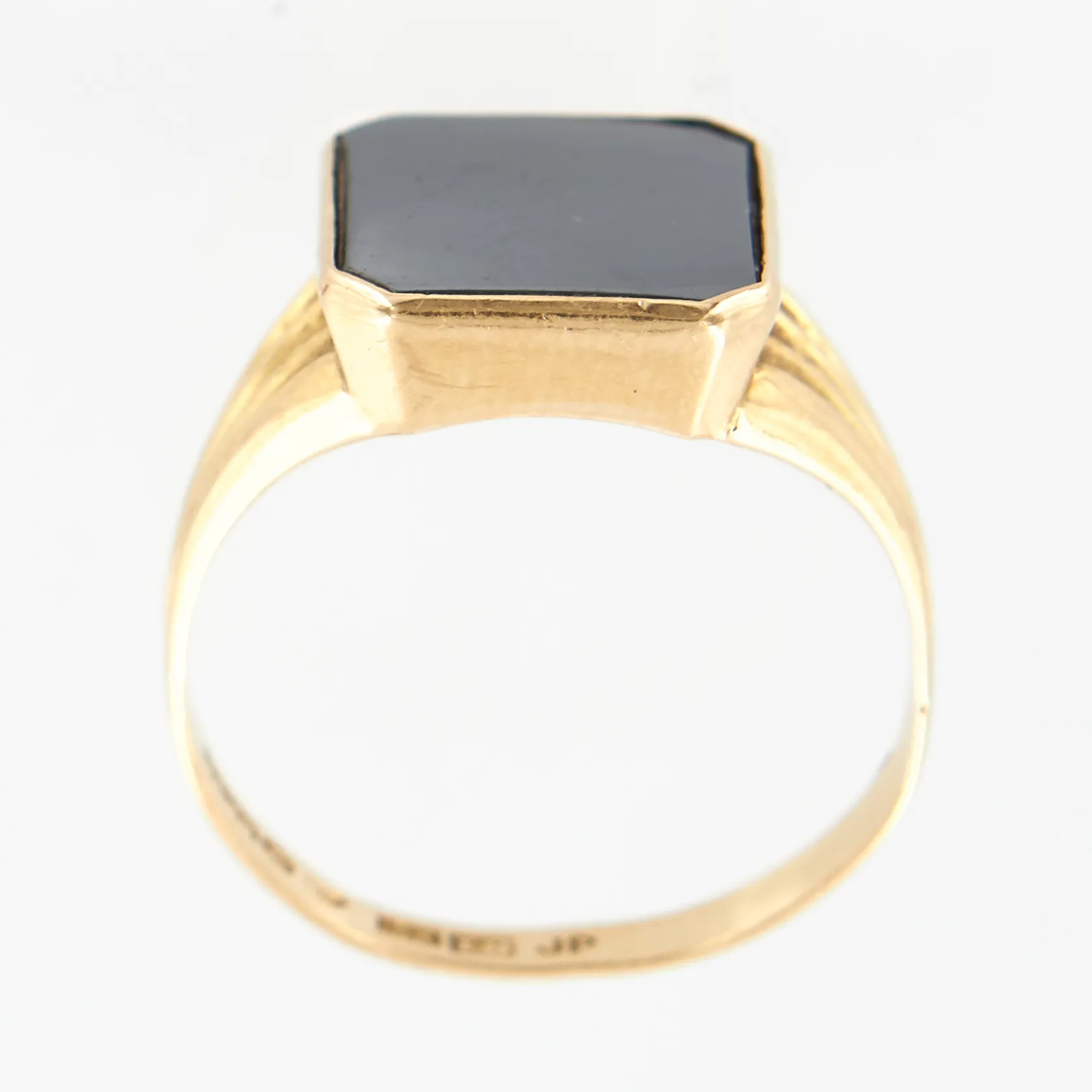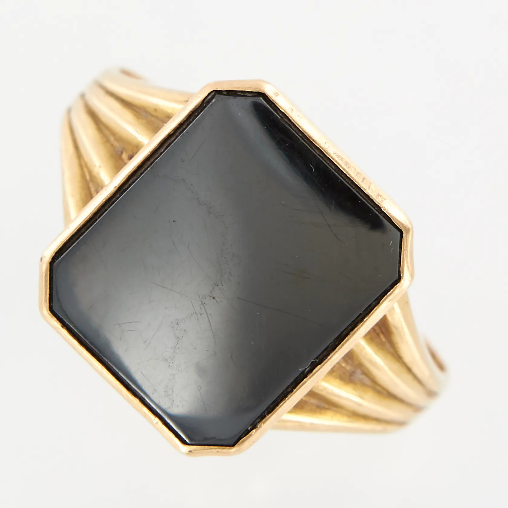 Klackring med hematit, stl 19, bredd 15mm, skev skena, smärre repor på sten, 18K Vikt: 5 g.