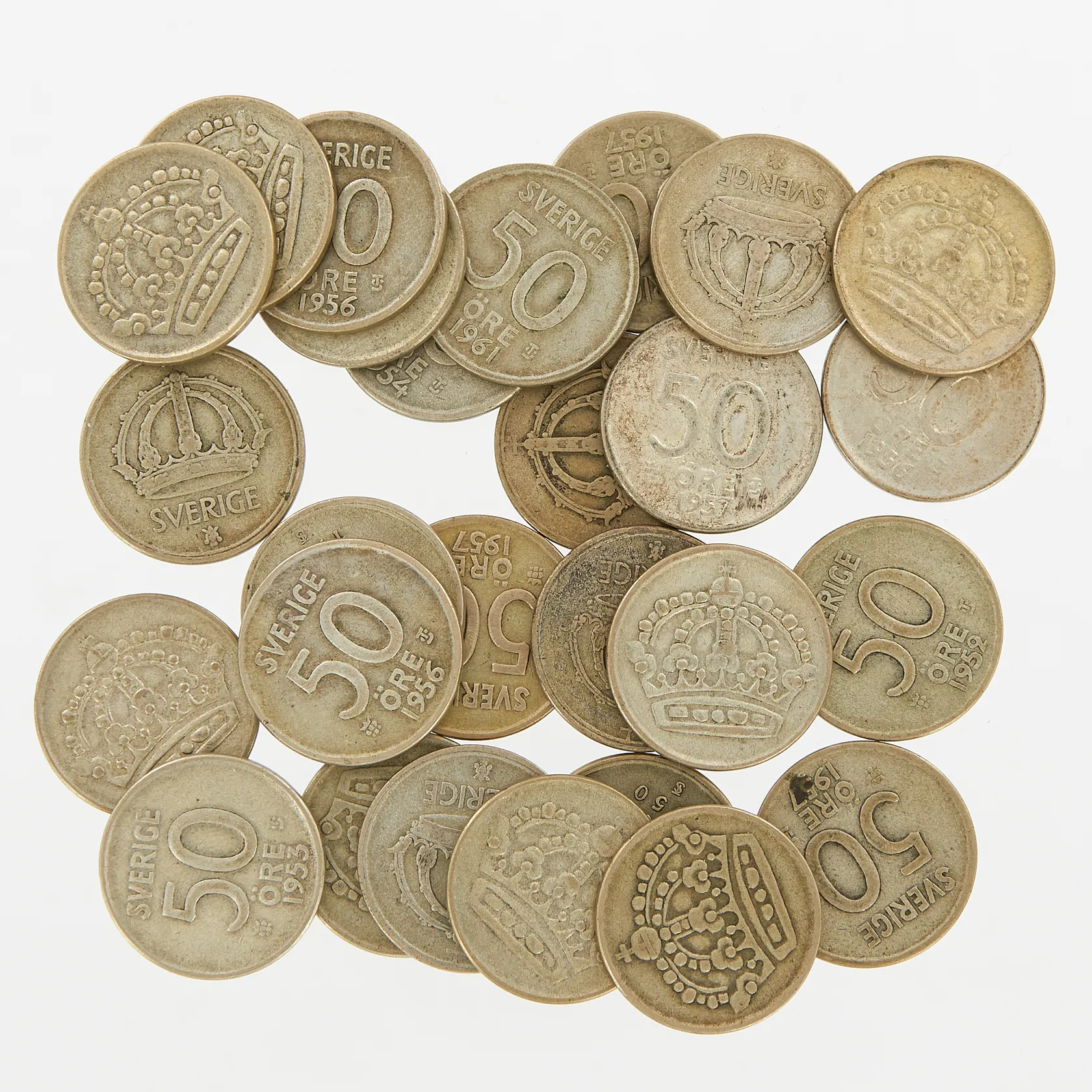 Mynt 27st, 50-öringar, silver 400/1000, Vikt: 129 g.