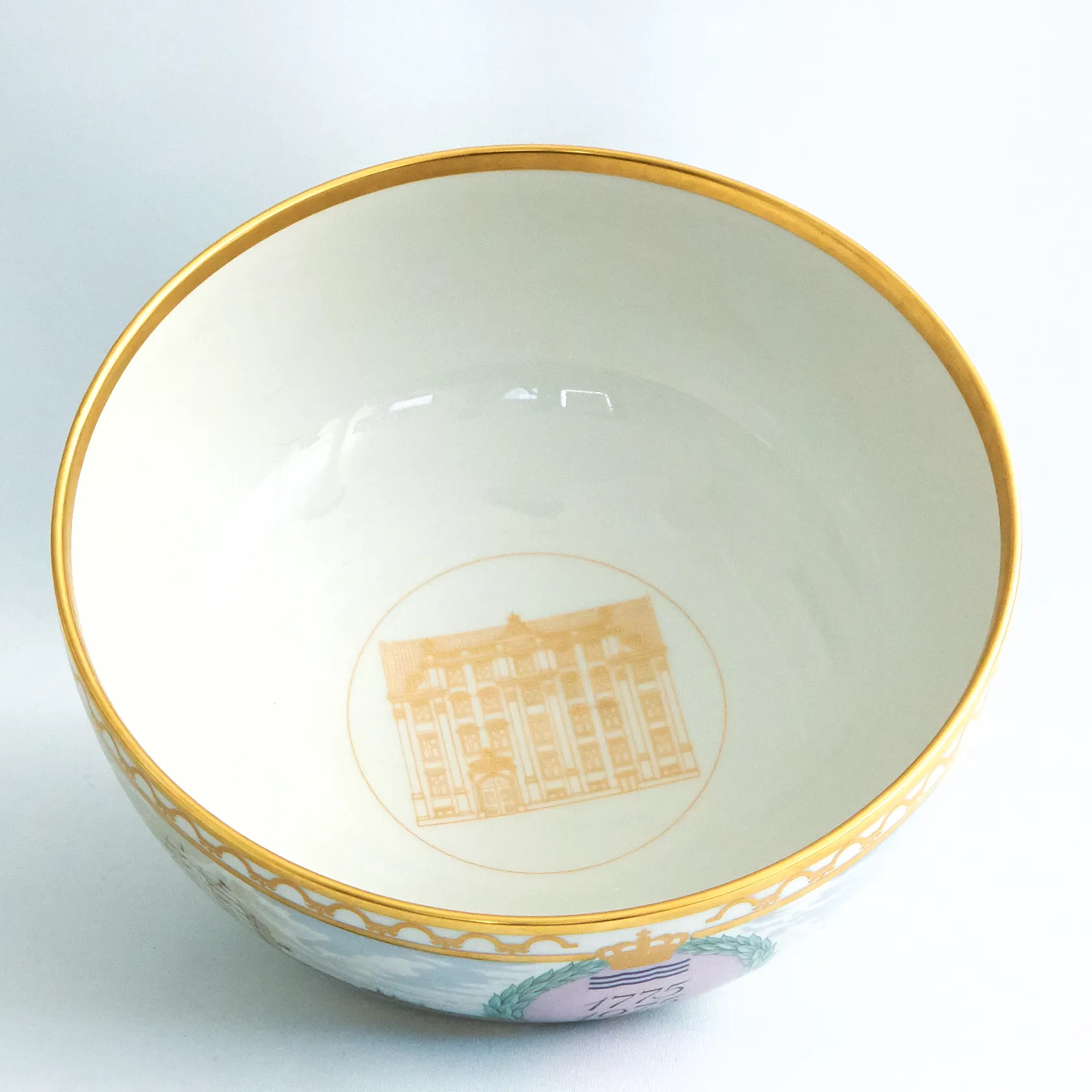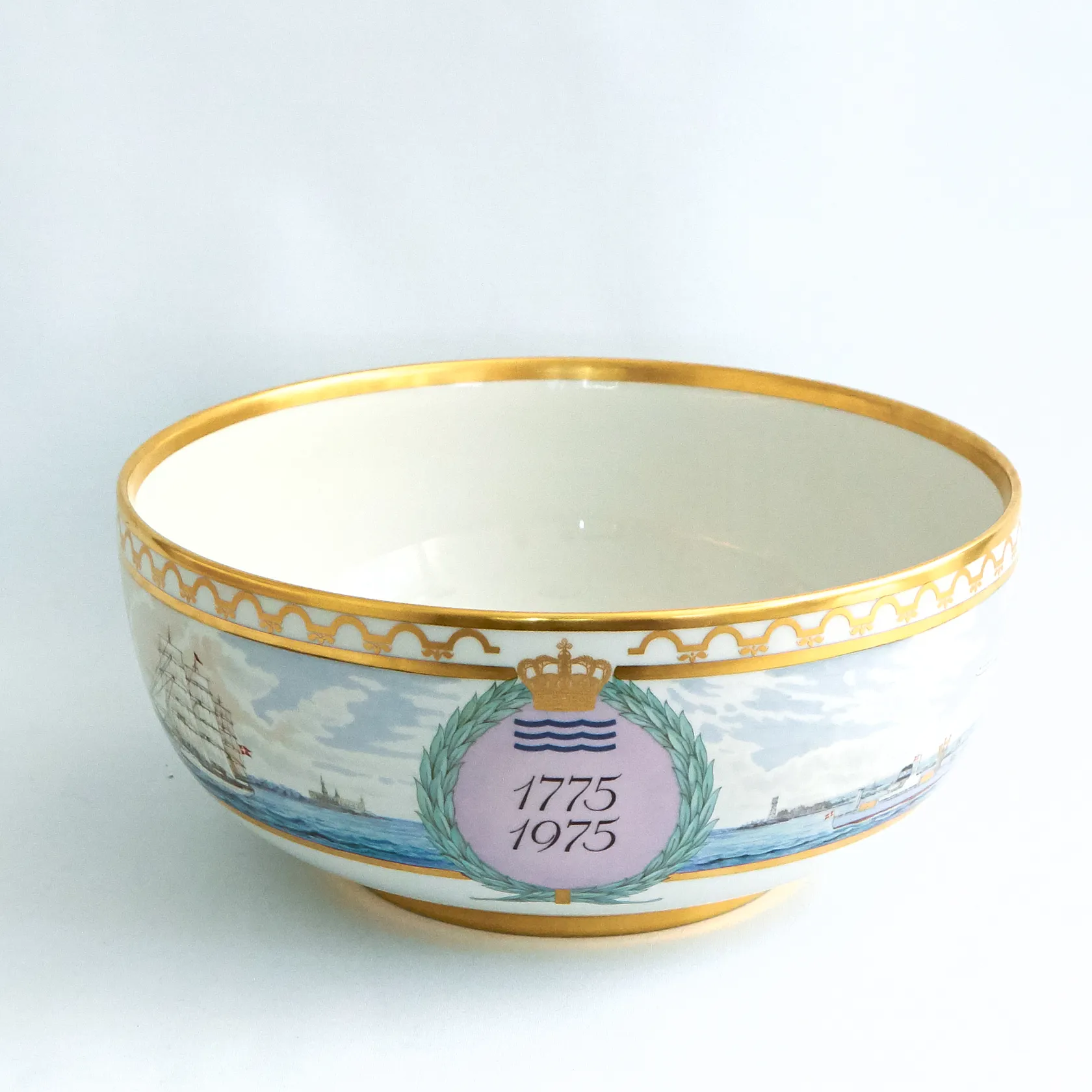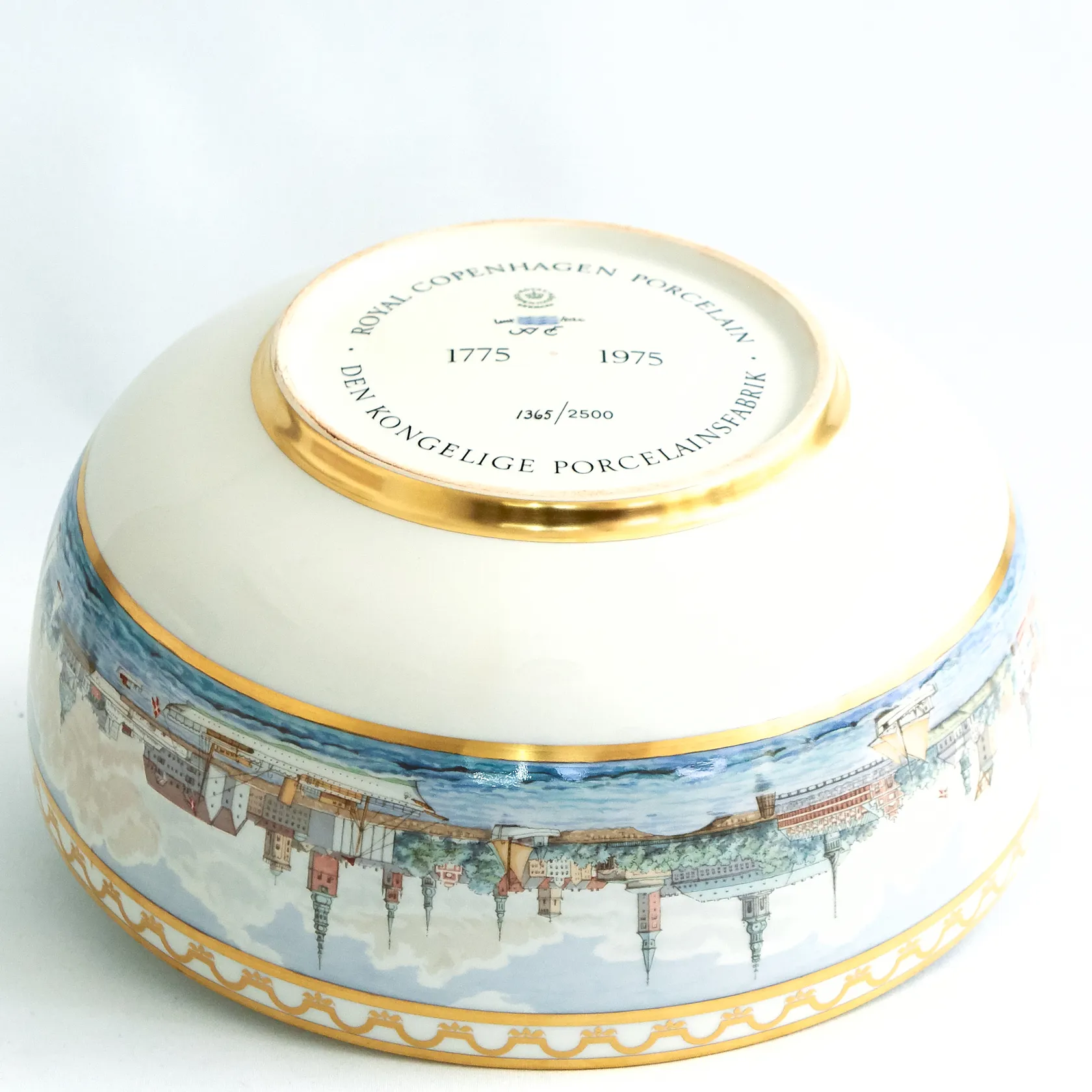 Bålskål, Royal Copenhagen, jubileumsutgåva, Utförd för fabrikens 200-årsjubileum den 1 maj 1975. Kopia efter skålen som tillverkades som minnesgåva efter sjöslaget vid Köpenhamn år 1801, Dekor av Köpenhamns siluett och Danmarks sydkust 1975 med förgyllda detaljer. Diameter 34cm, höjd 15 cm, numrerad 1365/2500 Skickas med postpaket.