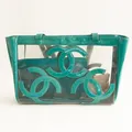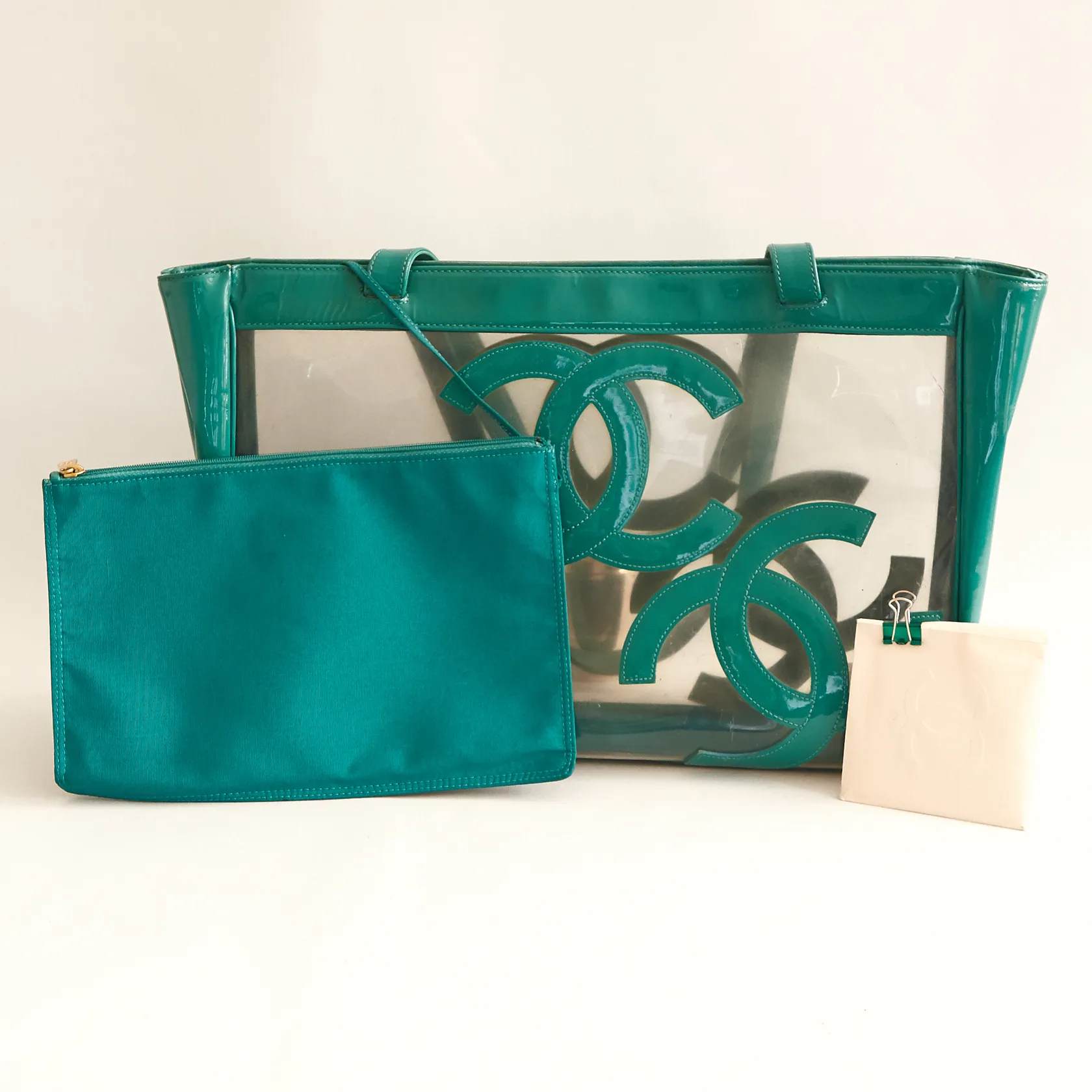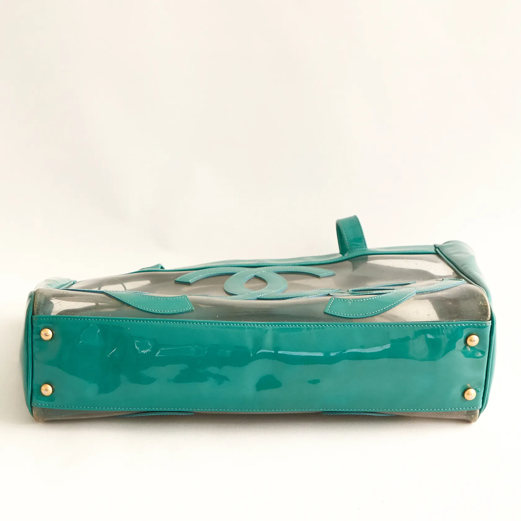 Väska Chanel, Teal Vinyl Patent Triple CC Tote, ca 38x27x11cm, datumkod: 9647573, år 2004-2005, bruksslitage/fläckar, tillhörande ej avtagbar clutch 27x18cm, dustbag,