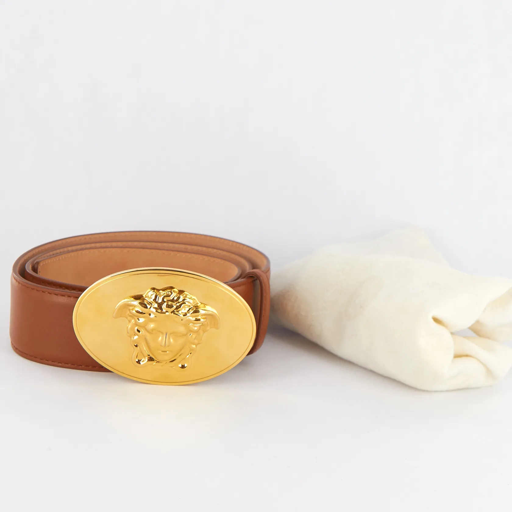 Bälte/ Skärp Versace, DCU4554.DvtP1, stl: 90/36, ljusbrunt skinn, spänne Medusa i guldfärgad metall, dustbag, nyskick,