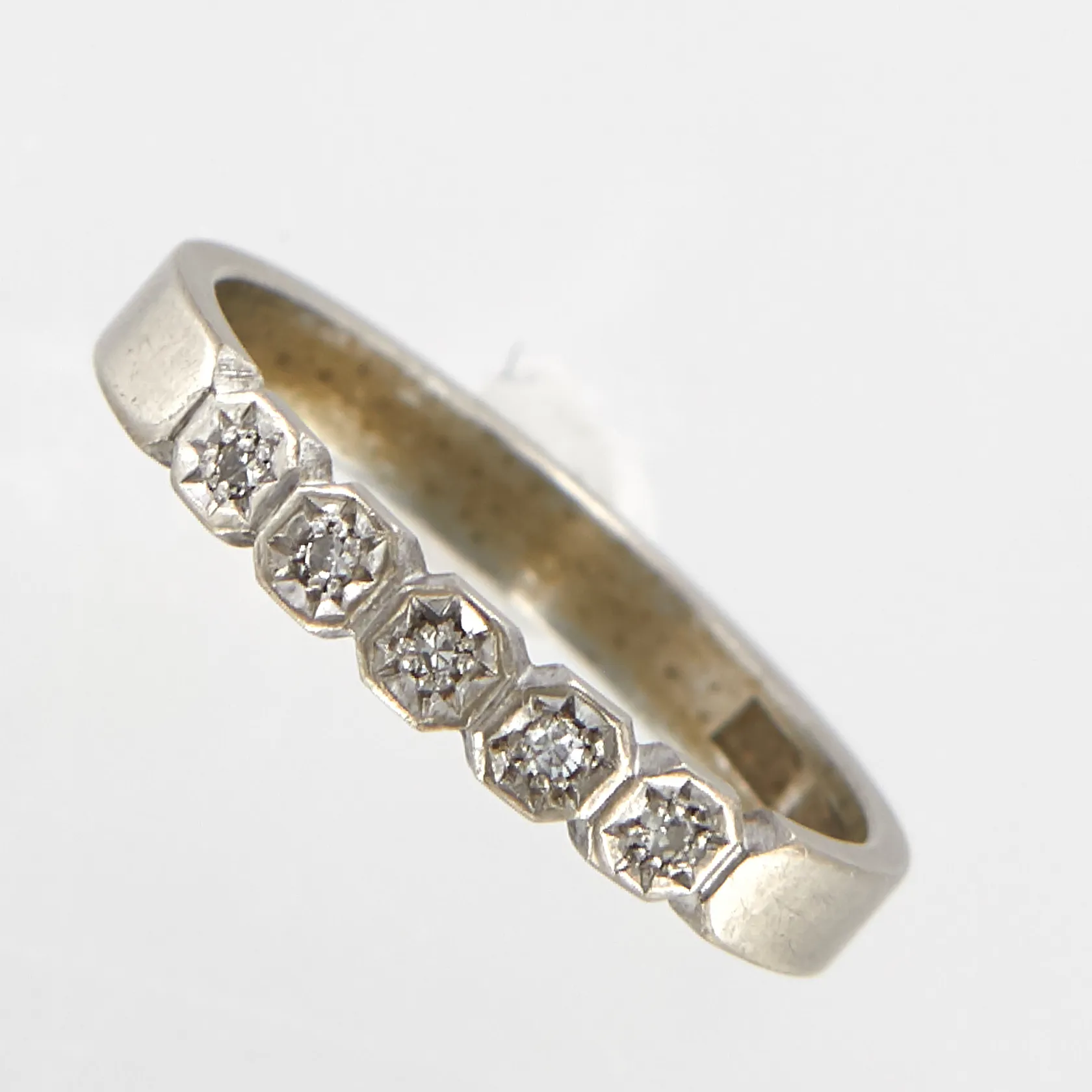 Ring, diamanter 0,05ctv enligt gravyr, stl 17½, bredd 2,5mm, vitguld, i behov av rodinering, 18K. Vikt: 2,7 g.
