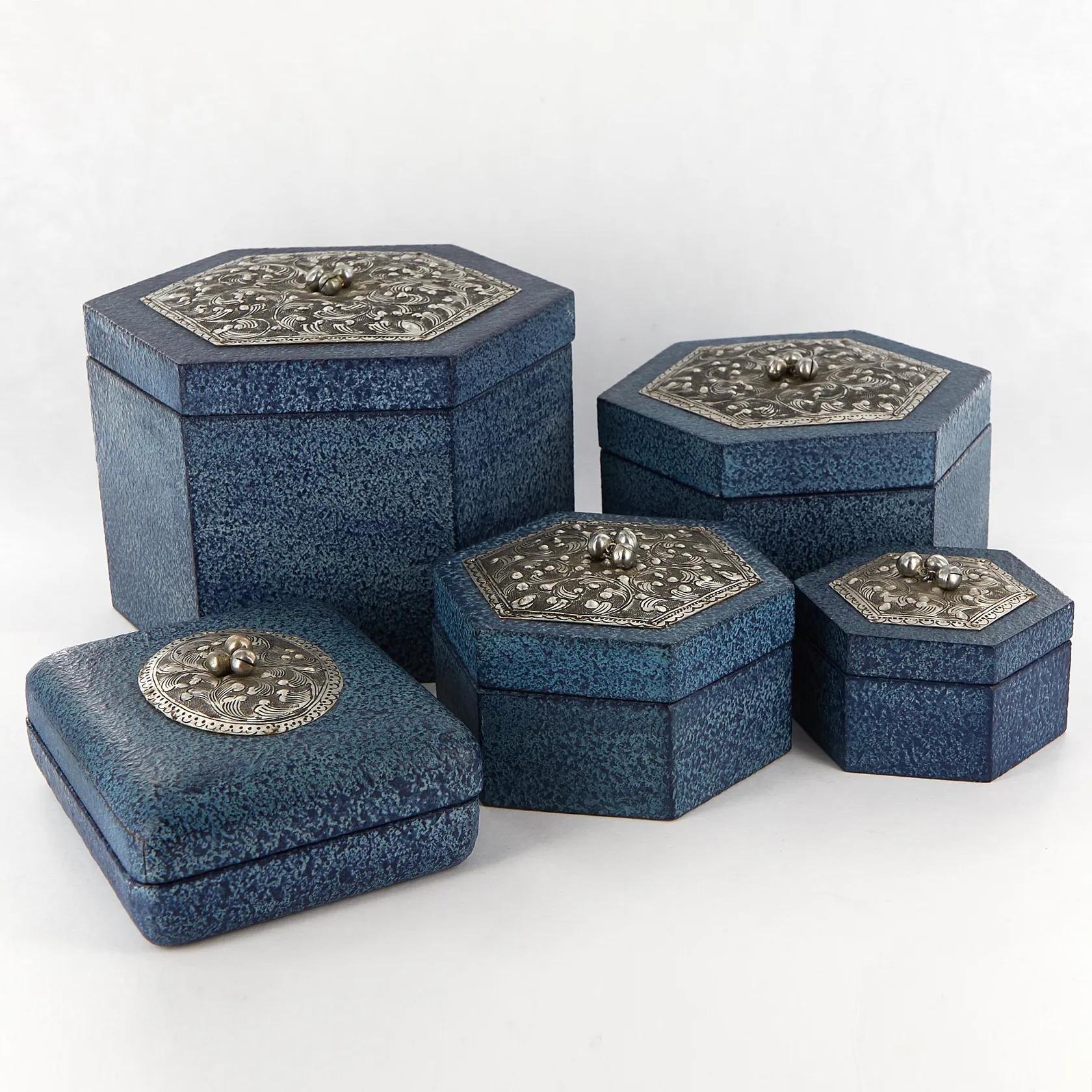Fem Askar, olika storlekar, detaljer i metall, omärkta,