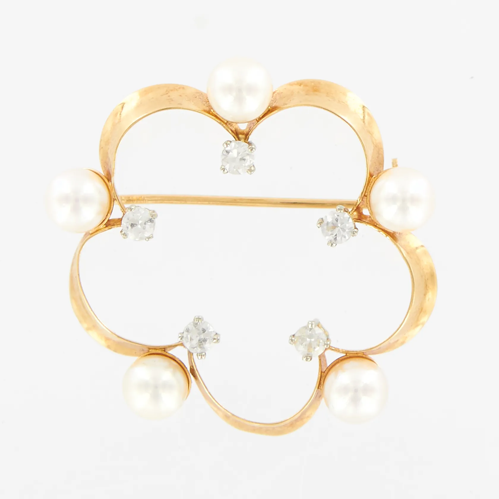 Brosch med Pärlor och vita stenar, Ø ca 32mm, 18K, Vikt: 4 g.