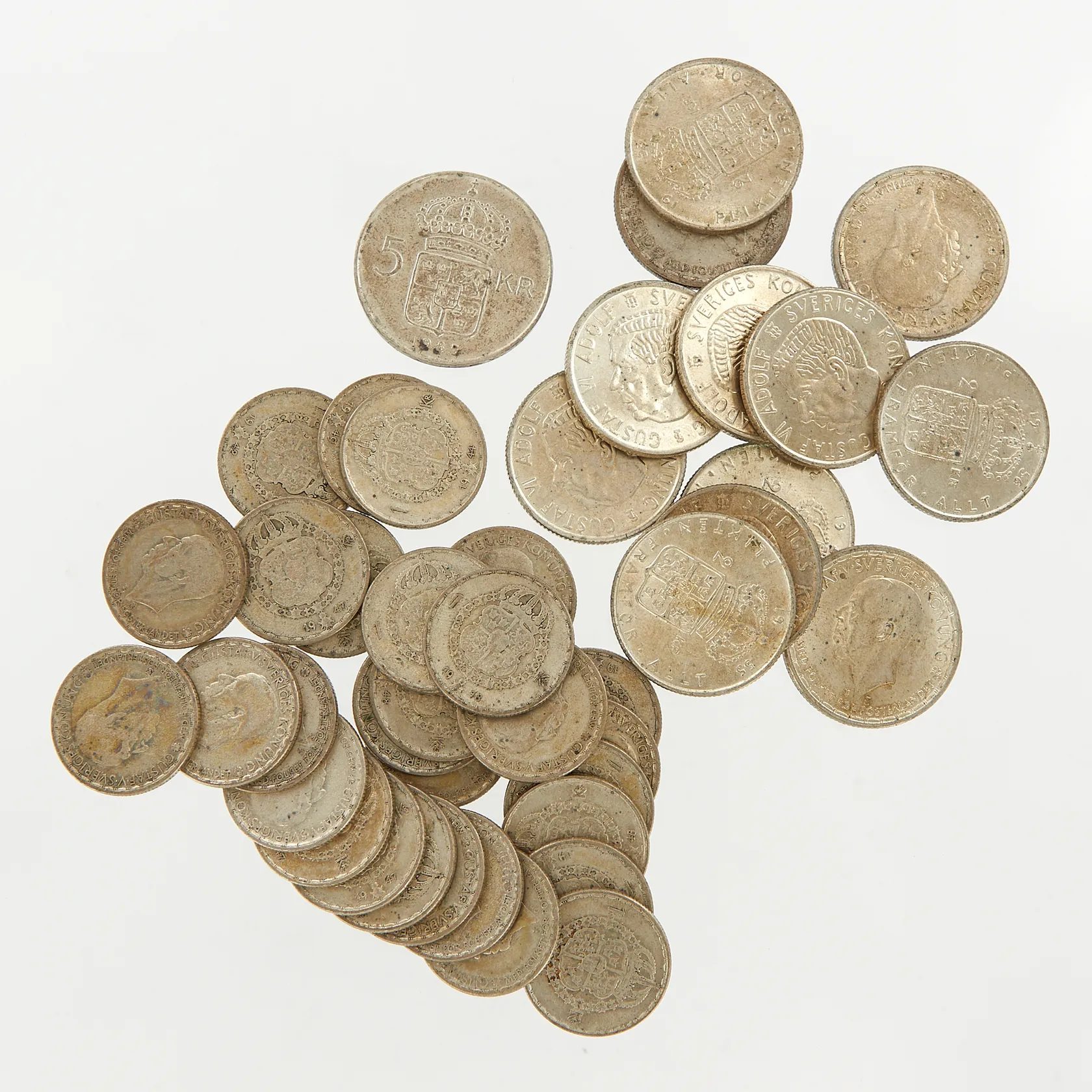 1 femkrona, 12 tvåkronor, 29 enkronor, silver 400/1000 Vikt: 386,6 g.