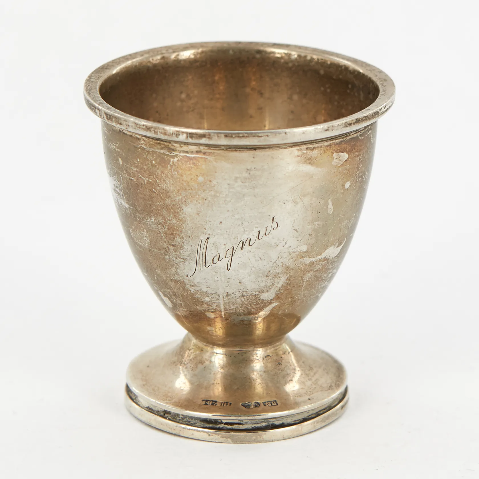 Äggkopp med gravyr, ca 5cm, 830/1000 Silver Vikt: 21,1 g.