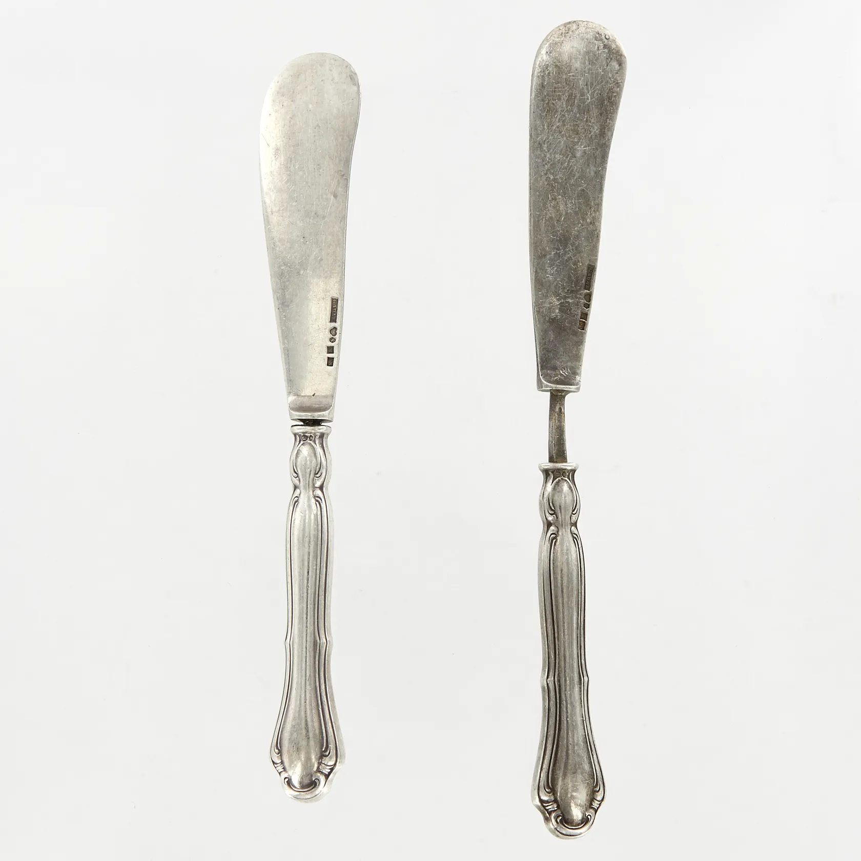 2 knivar, ca 16,5cm, en kniv defekt, fyllda skaft, 830/1000 Silver Vikt: 77,9 g.