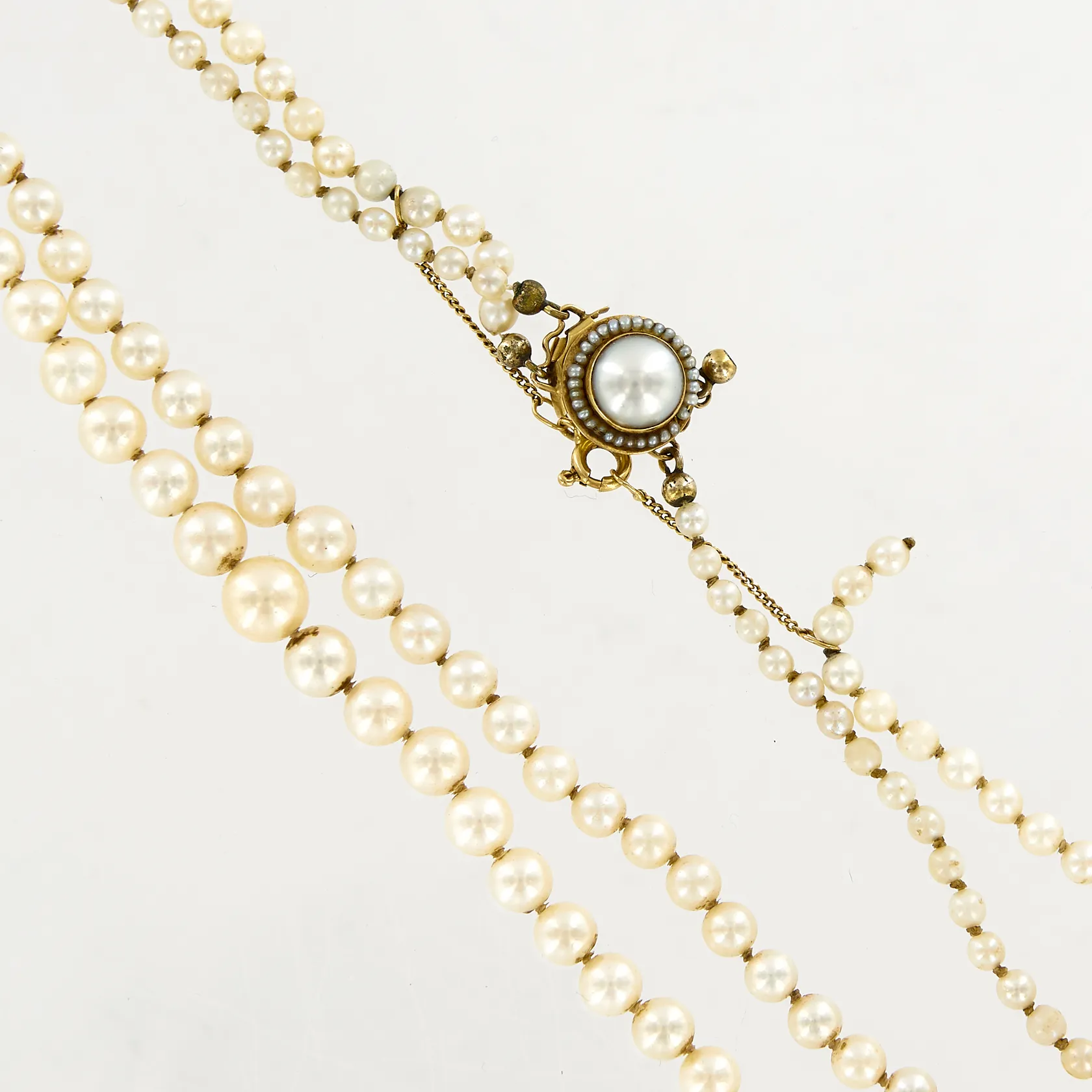 Pärlcollier, defekt, med lås samt säkerhetskedja i 18K guld, 46cm, stigbert/Engelbert, bruttovikt 25,2 gram Vikt: 25,2 g.