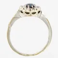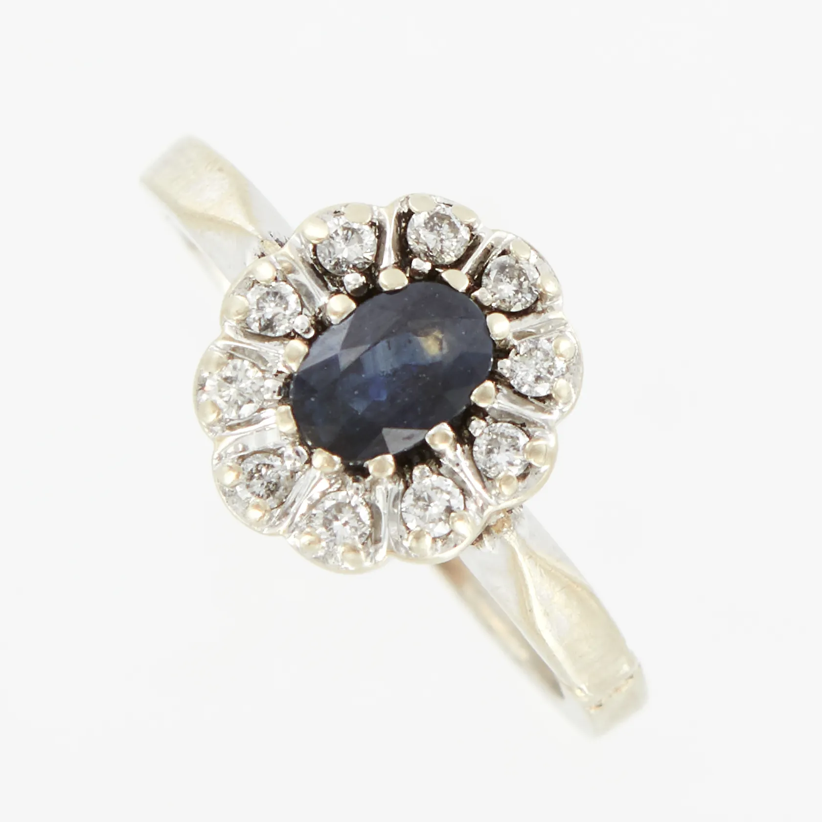 Ring med safir och diamanter ca 10x0,01ct, stl 18, ca 12mm framtill, behov av omrodinering, stort hack i skena, 18K Vikt: 3,9 g.