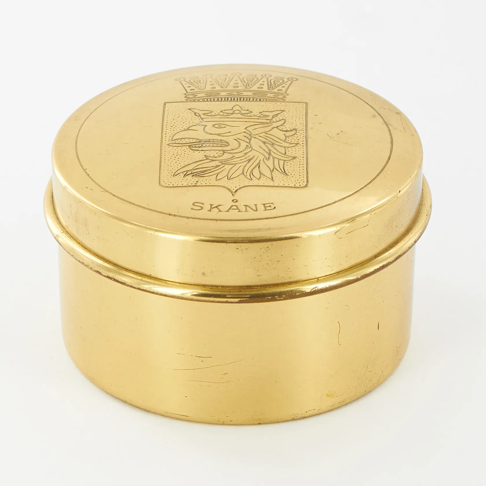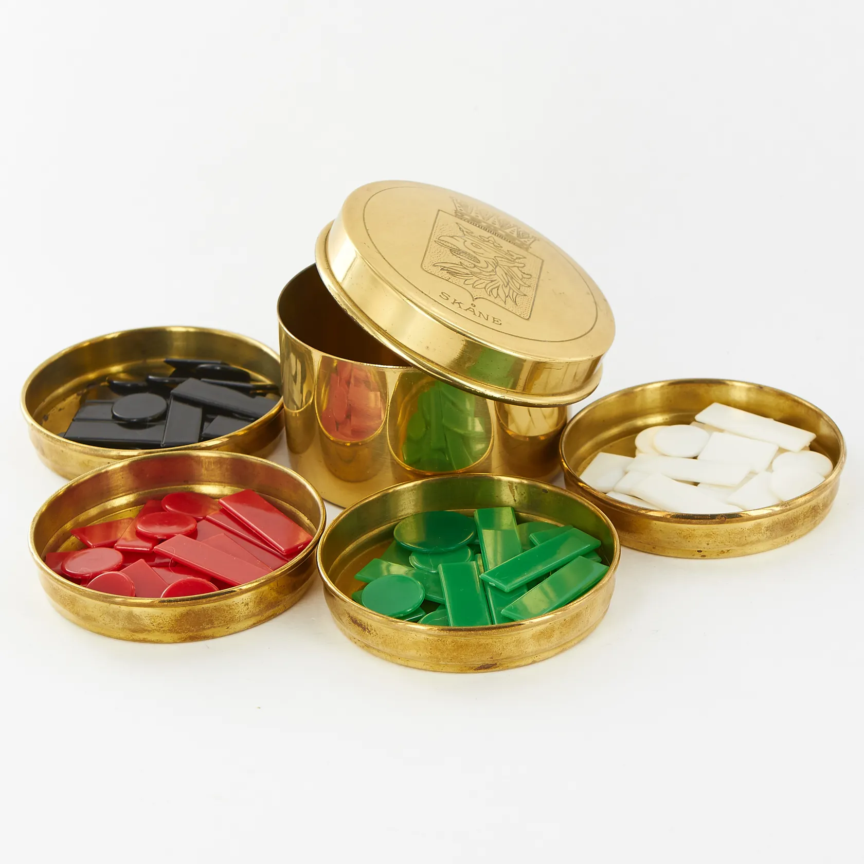 Mässingsburk med dekor av Skånes stadsvapen, "Virapulla", innehållande spelmarker i fyra olika färger,