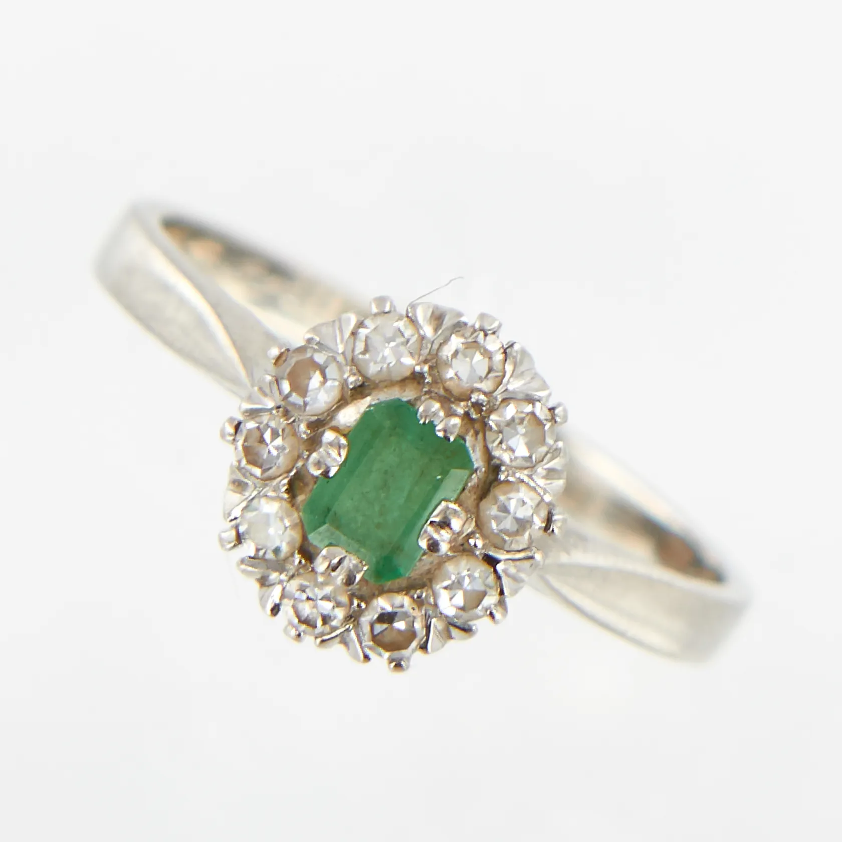 Ring vitguld, smaragd, 10 diamanter 8/8 slipade, ca 0,01ct, stl 16¼, bredd: 2-9mm, svag gravyr,18K Vikt: 2,5 g.