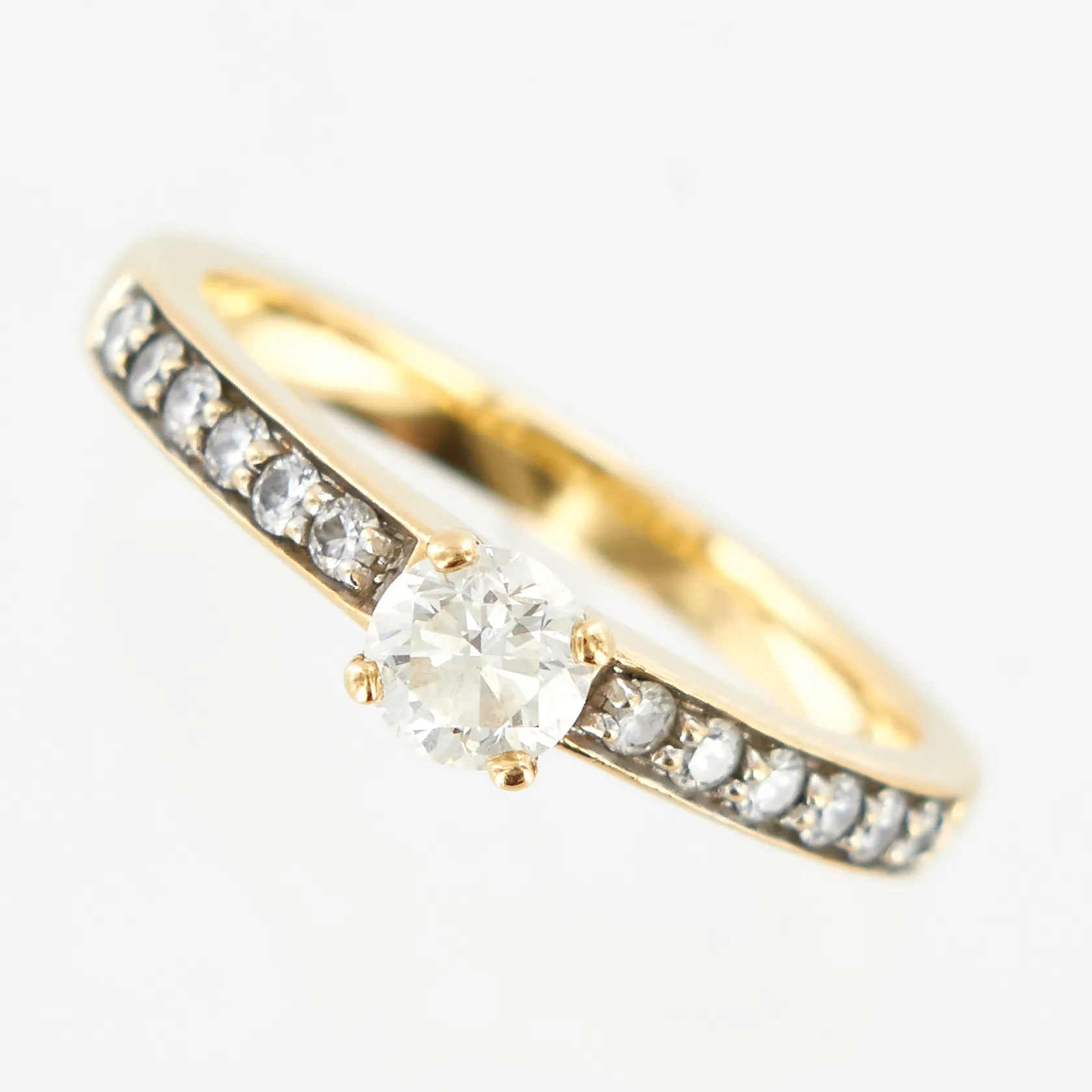 Ring, diamanter 0,76ctv, mittstenen ca 0,50ct, H/SI, stl 19, bredd: 3-5mm, kvalitetsintyg från Hallbergs Guld medföljer, GHA 18K Vikt: 5 g.
