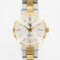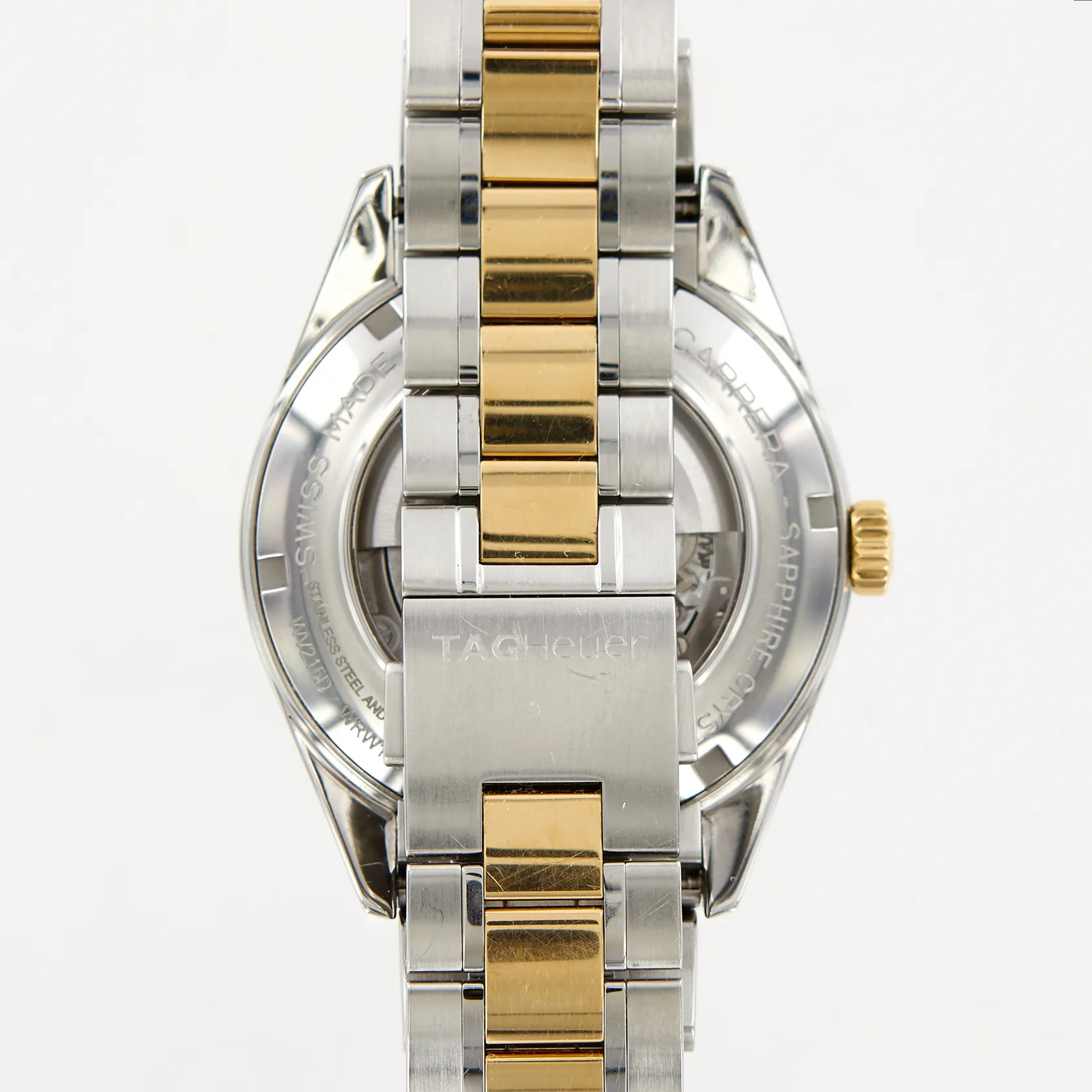 Herrur Tag Heuer Carrera, Calibre 5, automatisk, guld på stål, Ø39mm, länkens innermått 19,5cm, modell-nr: WV215D, WRW1651, bok, tag, garantikort ej ifyllt, inköpt Japan 2017