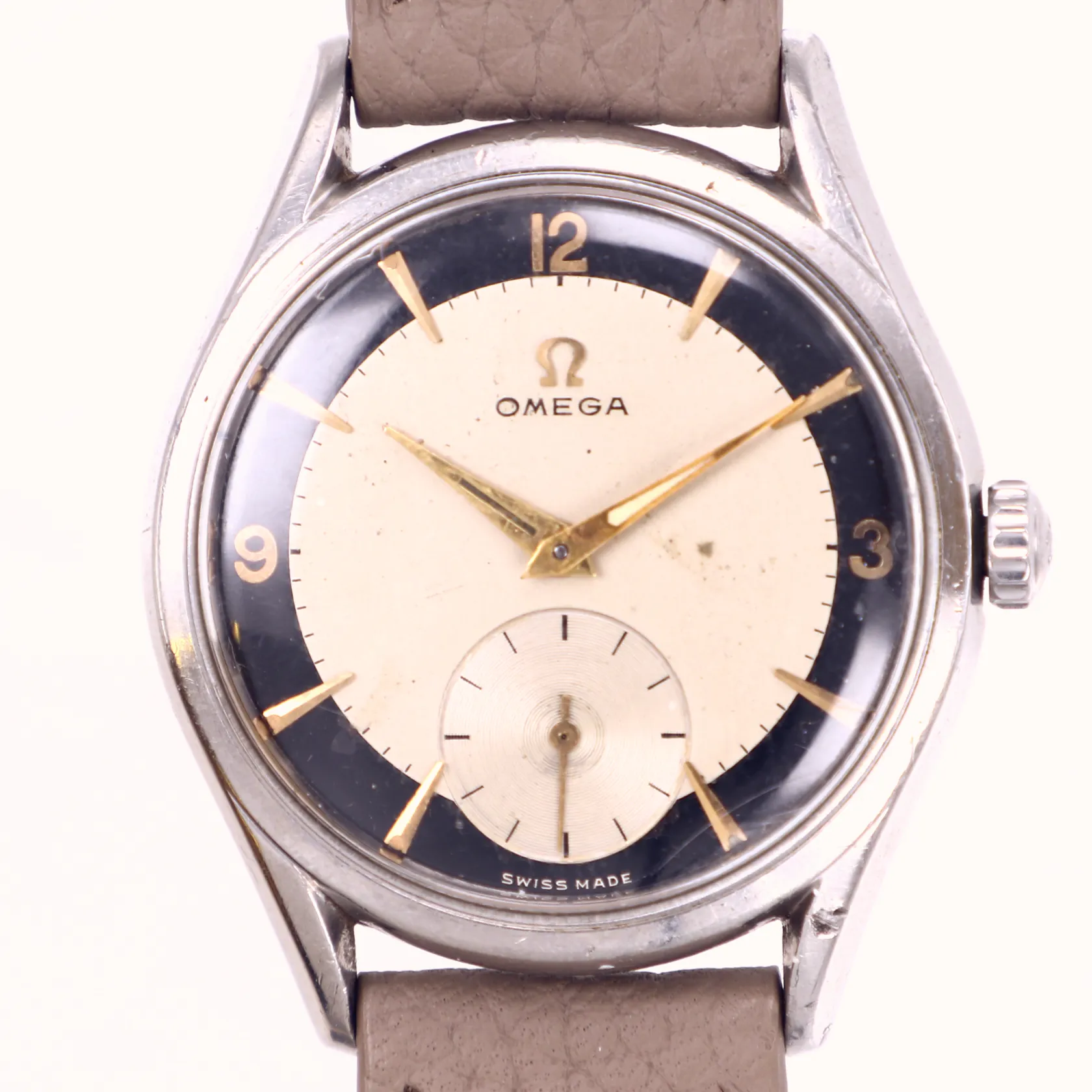 Herrur, Omega, Ø36mm, tuxedo dial, manuell, liten sekundvisare, plexiglas, stål, 1950-tal, gravyr VH, repor, små bucklor, läderband ej original, inga tillbehör