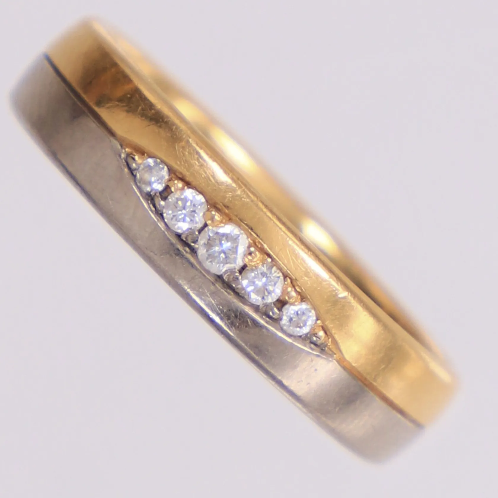 Ring med briljantslipade diamanter ca 0,09ctv, stl 17¾, bredd 4,9mm, rödguld/vitguld, Schalin, 18K Vikt: 6 g.