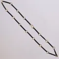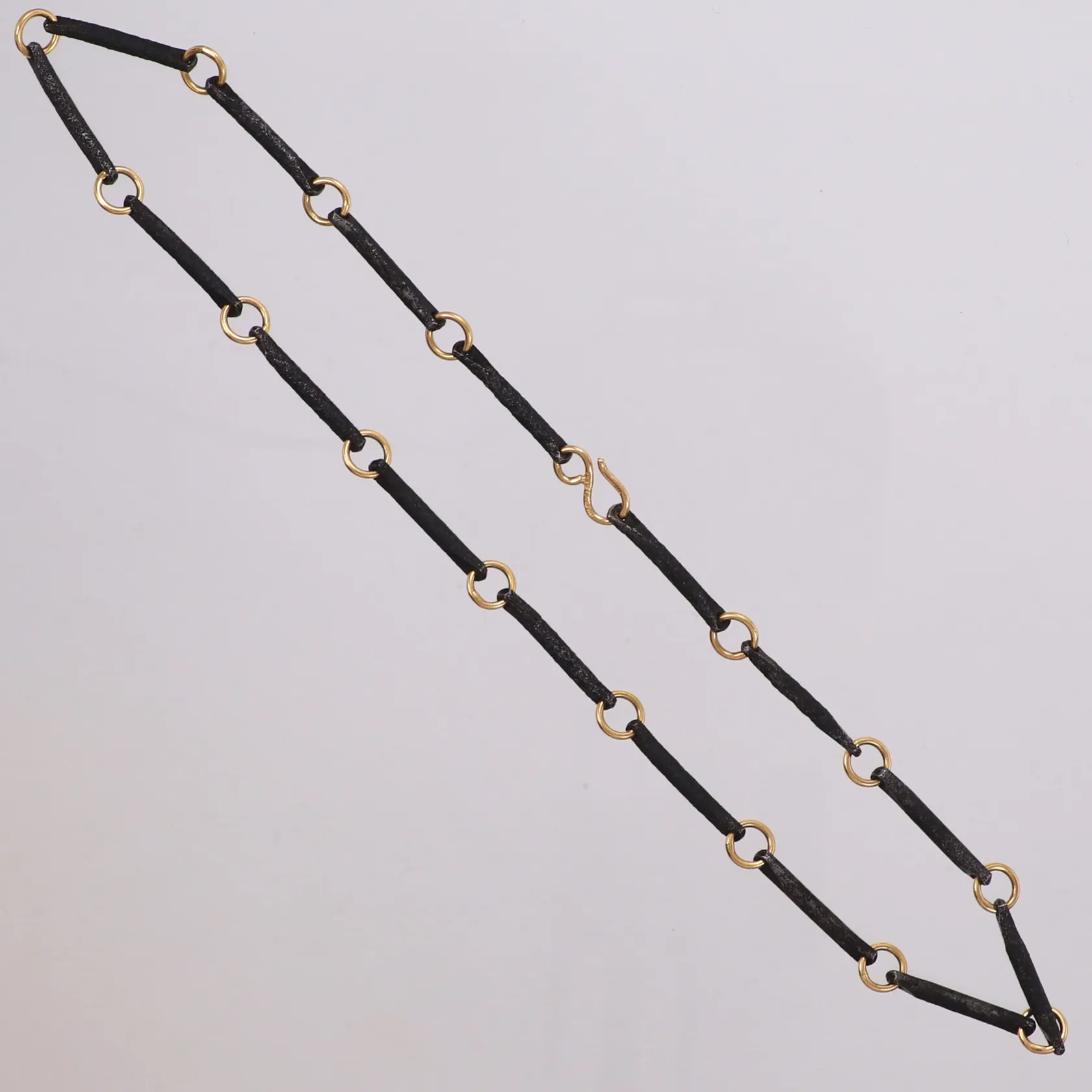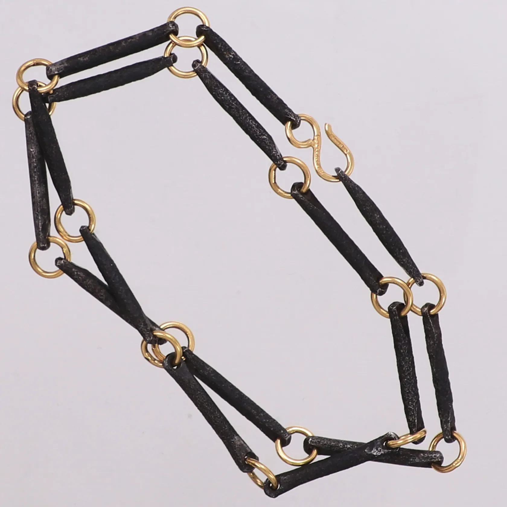 Collier, Hedvig Westermark, Smide och Form, Stockholm, oxiderat järn med detaljer i 18K, längd 45cm, bredd 7,6mm, originalask. Bruttovikt 23,8g. Vikt: 8 g.