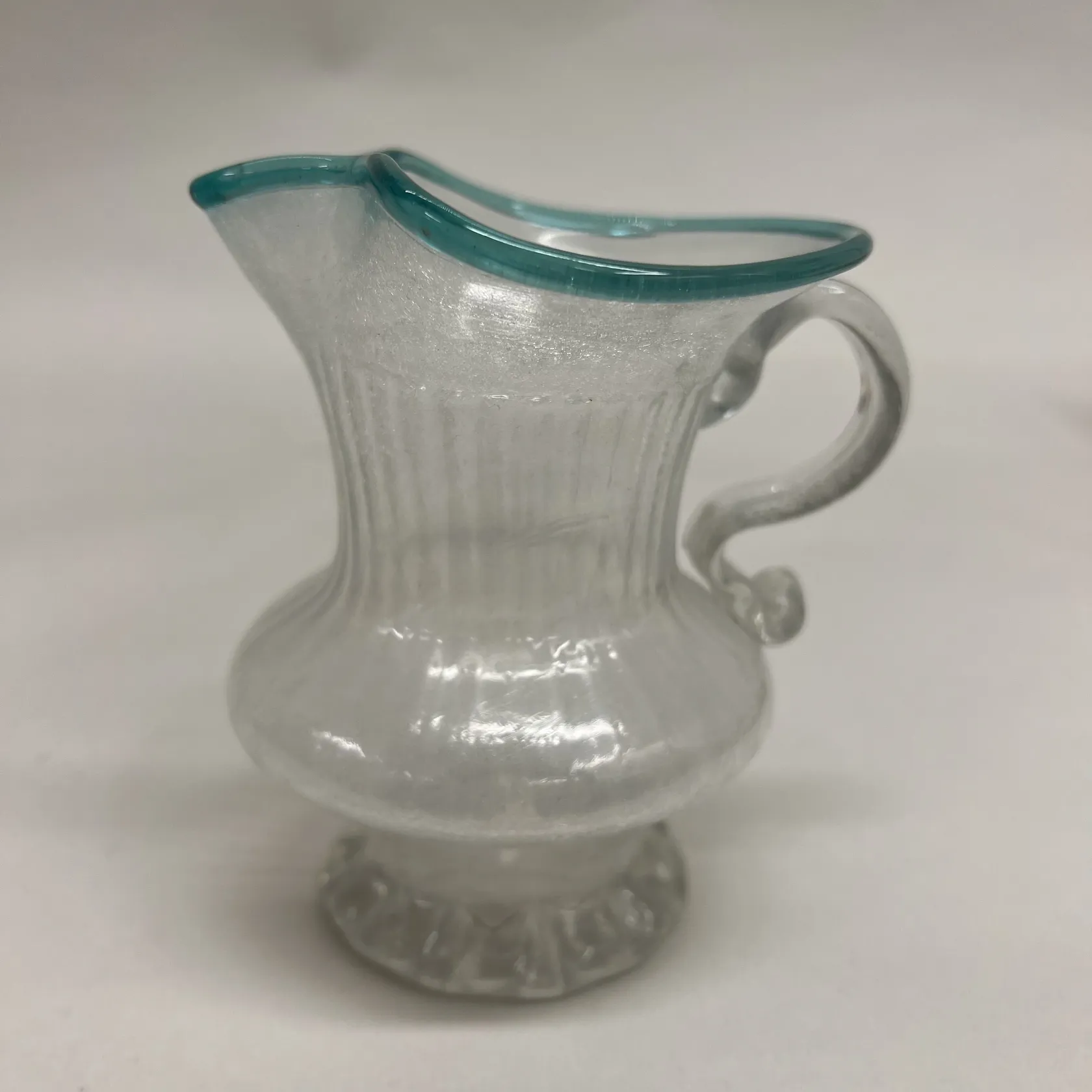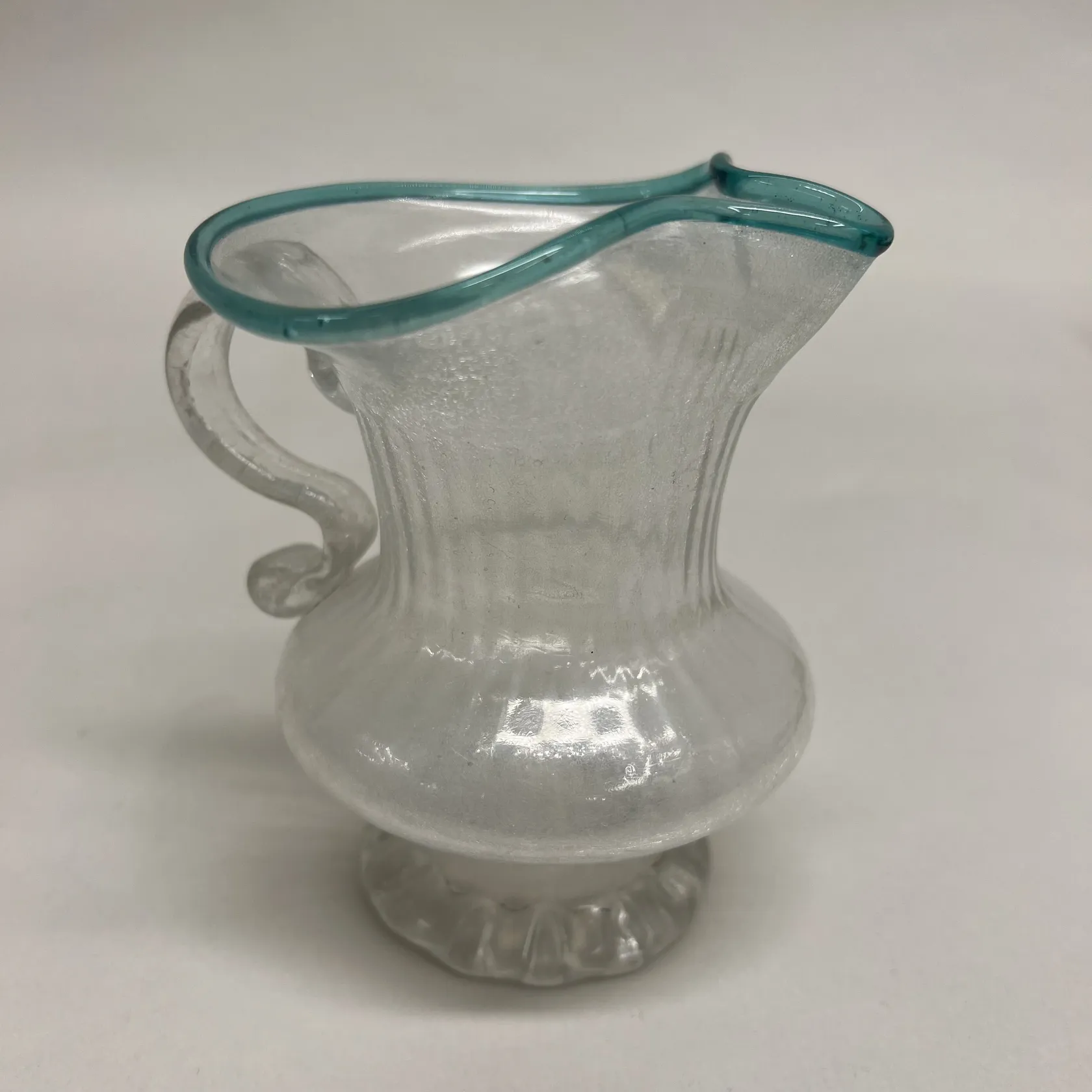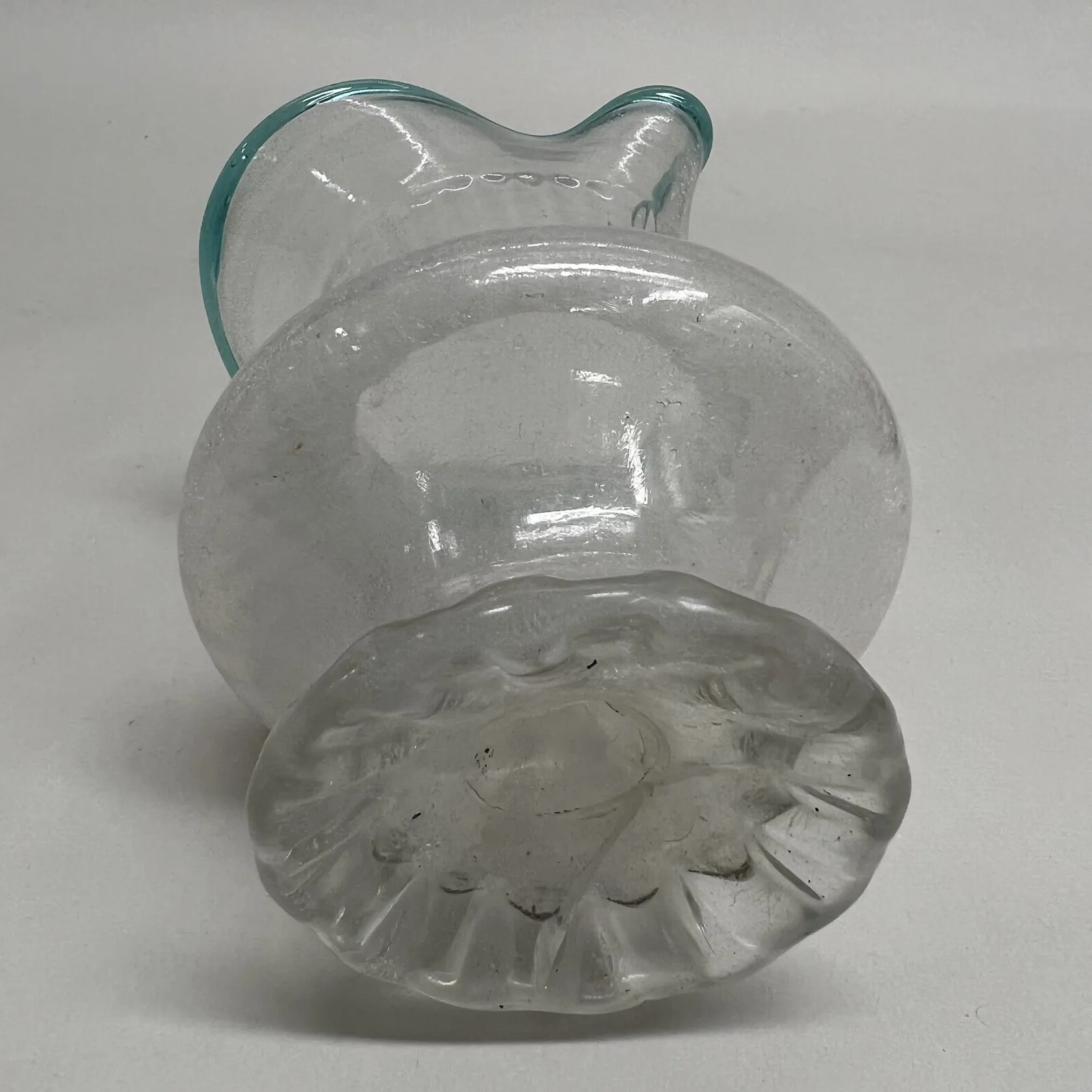 Kanna, sannolikt Venedig, sent 1700-tal, optikblåst glas, påklippt mynning i blågrönt, veckad fot, höjd ca 12,5cm, glassjuk, spricka i botten