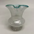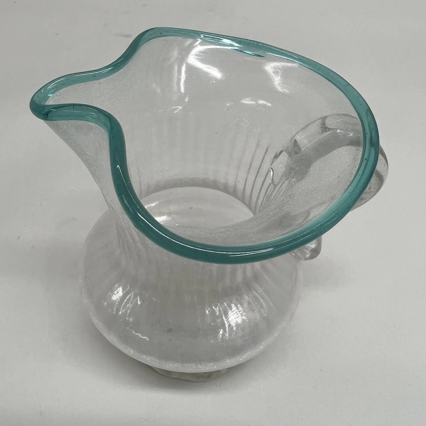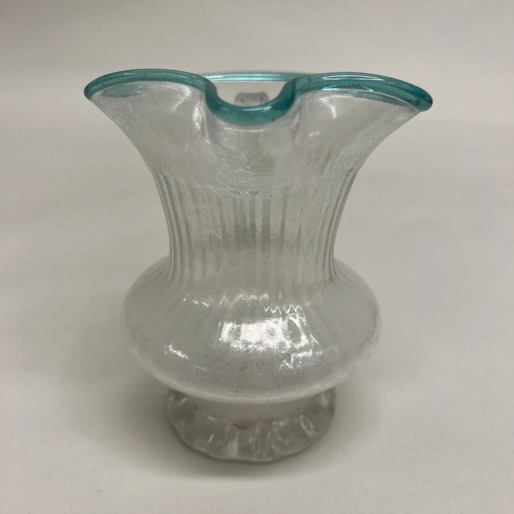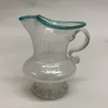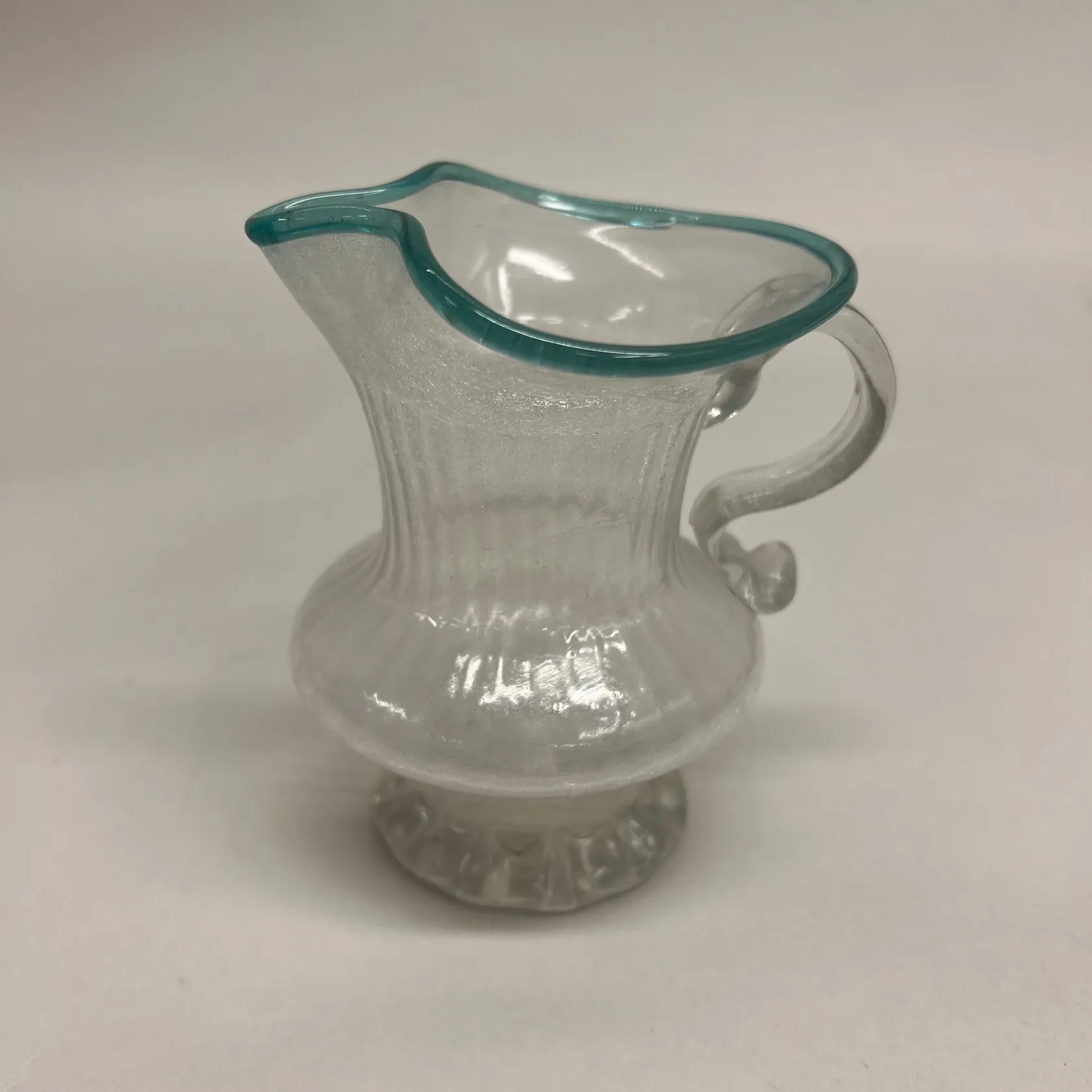 Kanna, sannolikt Venedig, sent 1700-tal, optikblåst glas, påklippt mynning i blågrönt, veckad fot, höjd ca 12,5cm, glassjuk, spricka i botten