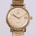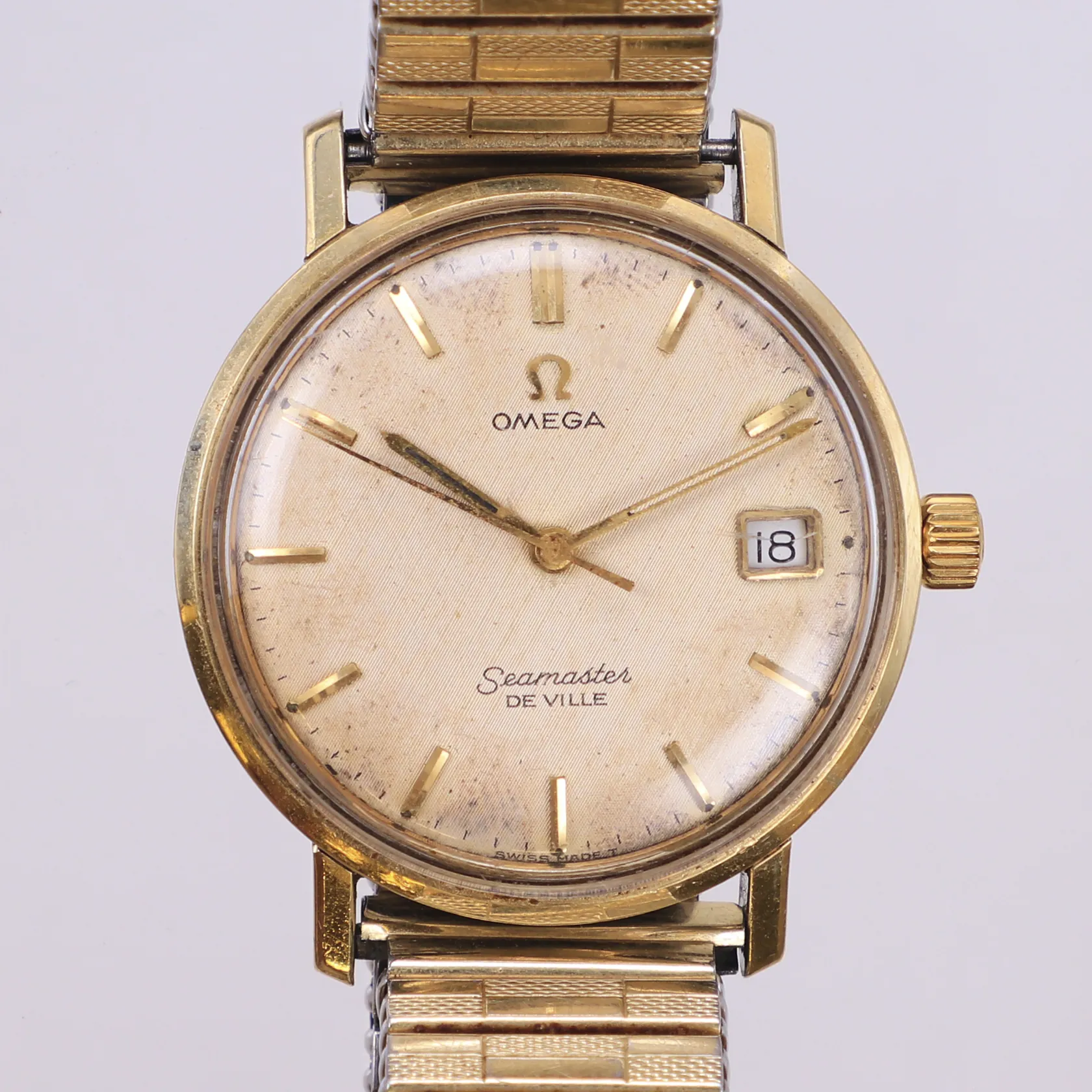 Herrur, Omega Seamaster De Ville, Ø34mm, guld på stål, manuell, ny originalkrona, datum, fläckar på visare och urtavla, repor på plexiglas samt boett, flexband, inga tillbehör.