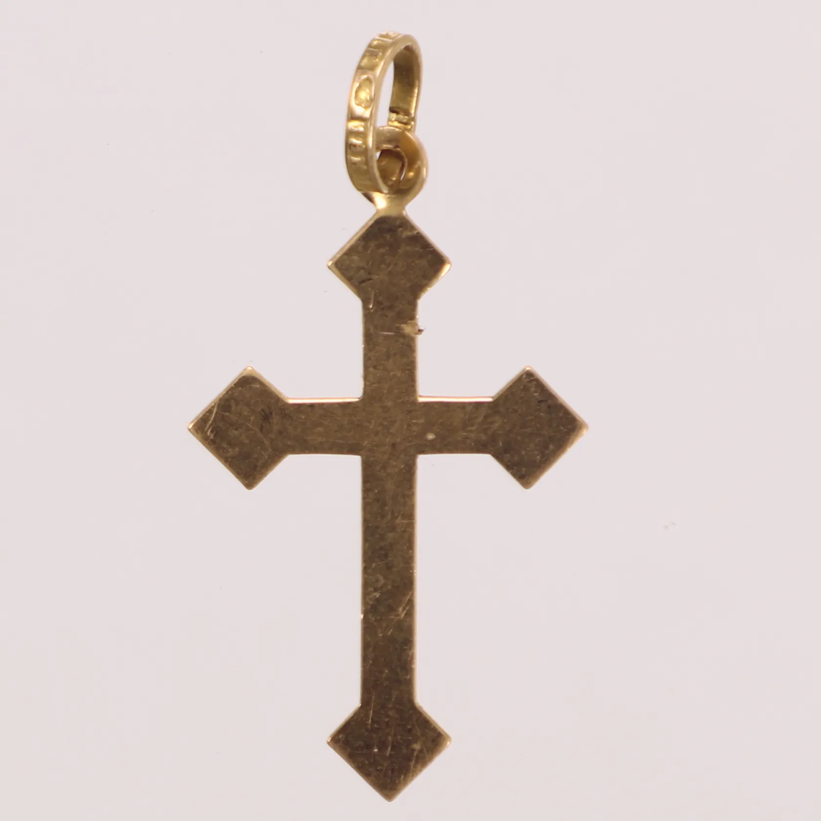 Hänge kors, längd ca 28mm, bredd 14mm, 18K guld. FINNS FÖR VISNING PÅ PANTBANKEN ÖSTERMALM Vikt: 0,6 g.