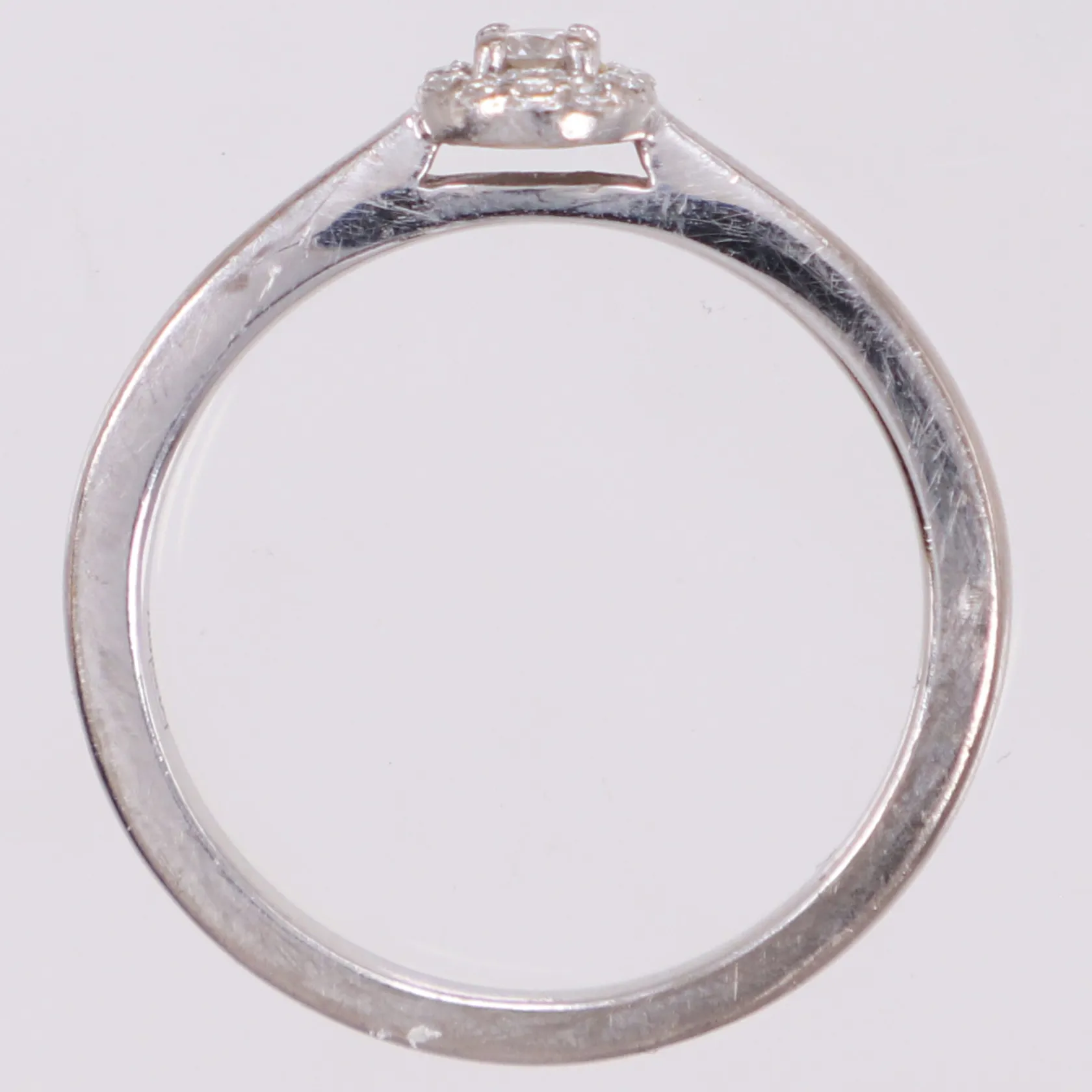 Ring med diamanter 1 x ca. 0,05 + 12 x ca. 0,005ct, Ø17, bredd: 2mm, GHA, vitguld, 18K Vikt: 3,4 g.