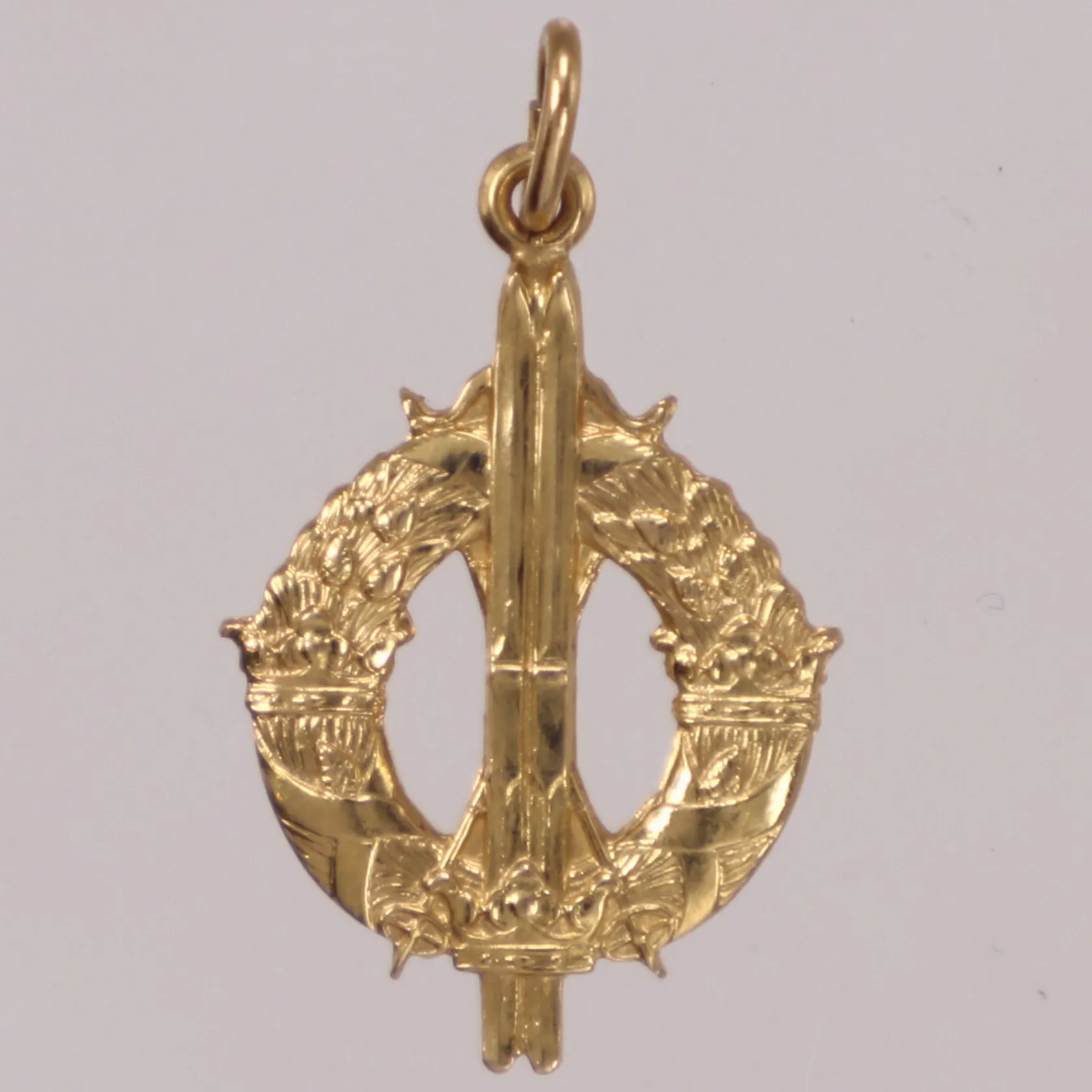 Hänge med dekor av tre kronor, längd 24mm, bredd ca 14mm, Sporrong, år 1972, 18K Vikt: 1,8 g.