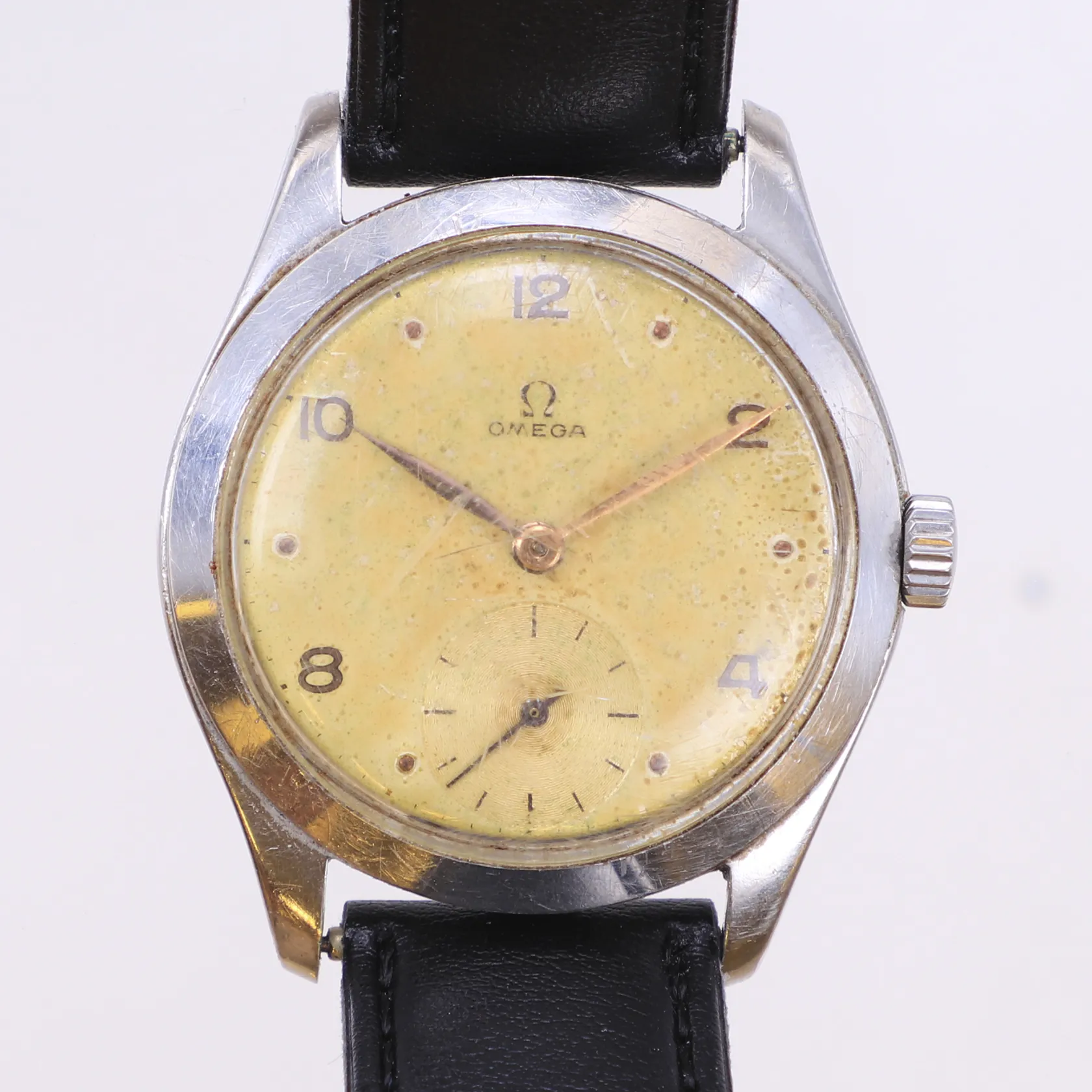 Herrur Omega, manuell, liten sekundvisare, plexiglas, Ø35,5mm, cal: 265, boettnr: 2489 5, verk-nr: 12001010, ca år 1950, läderarmband, repigt glas, skadad urtavla, gravyr