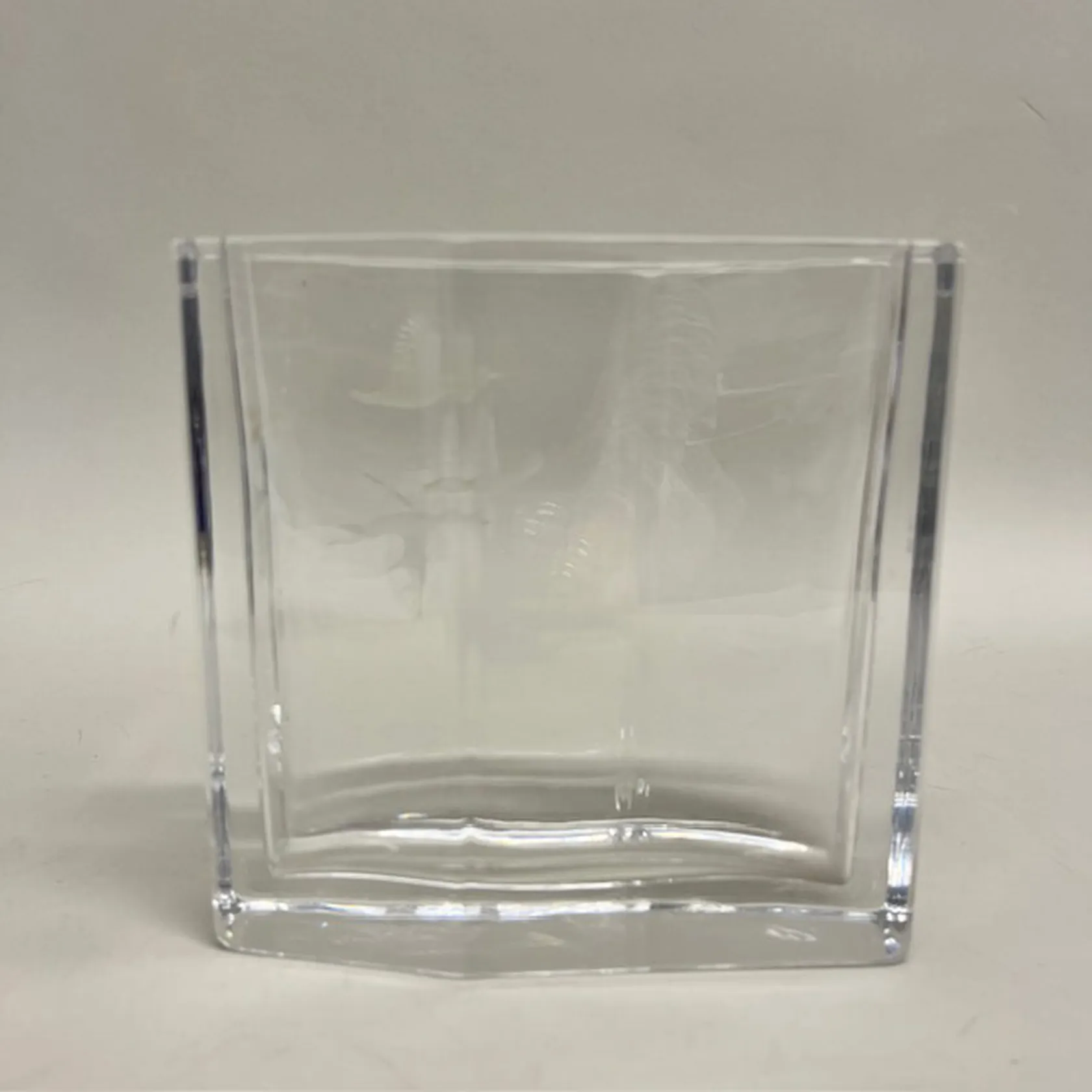 Vas, höjd 15cm, bredd 16cm, graverad dekor av fåglar, design Bengt Edenfalk, Skruf, signerad ELB 3-5, repor undertill, kristall Skickas med paket..