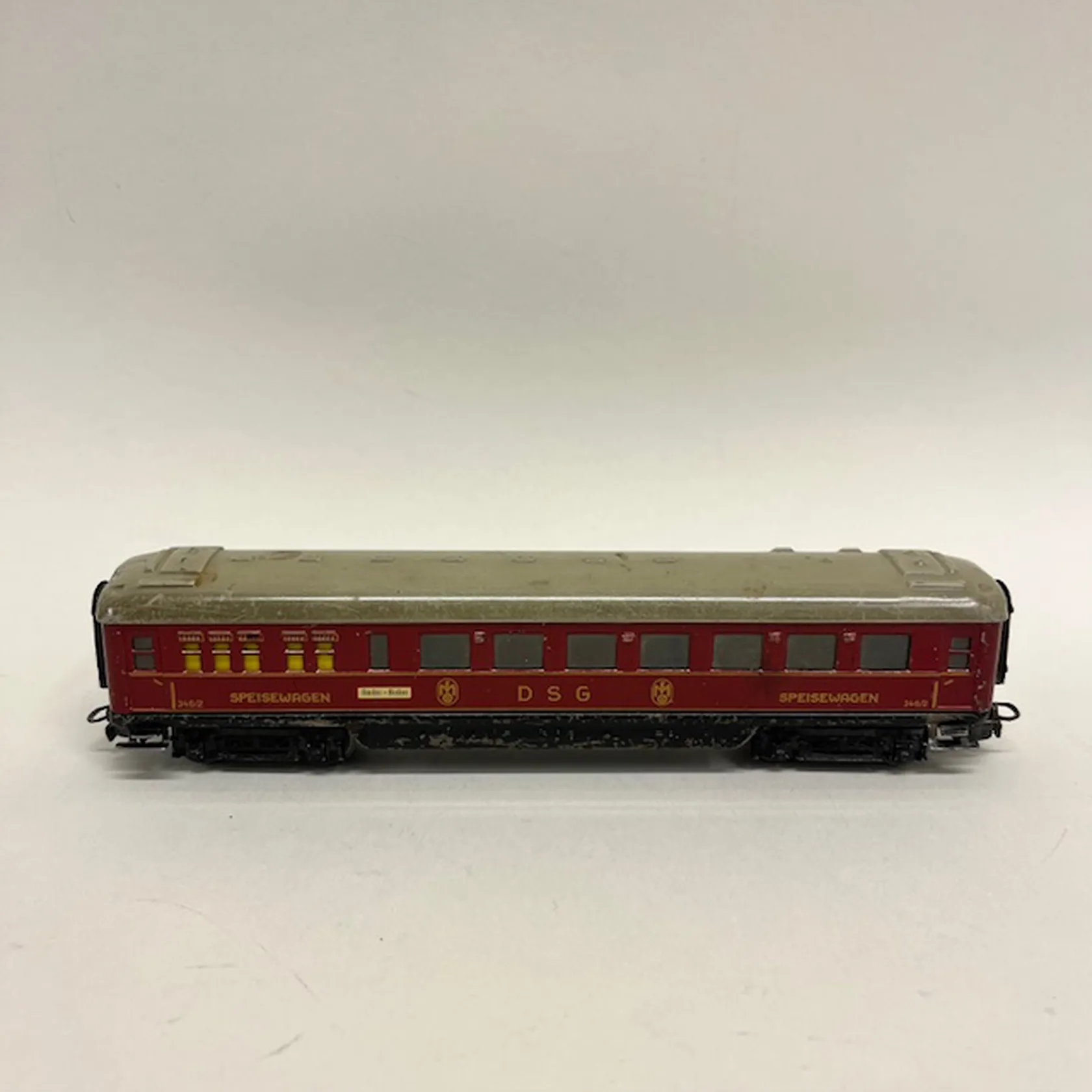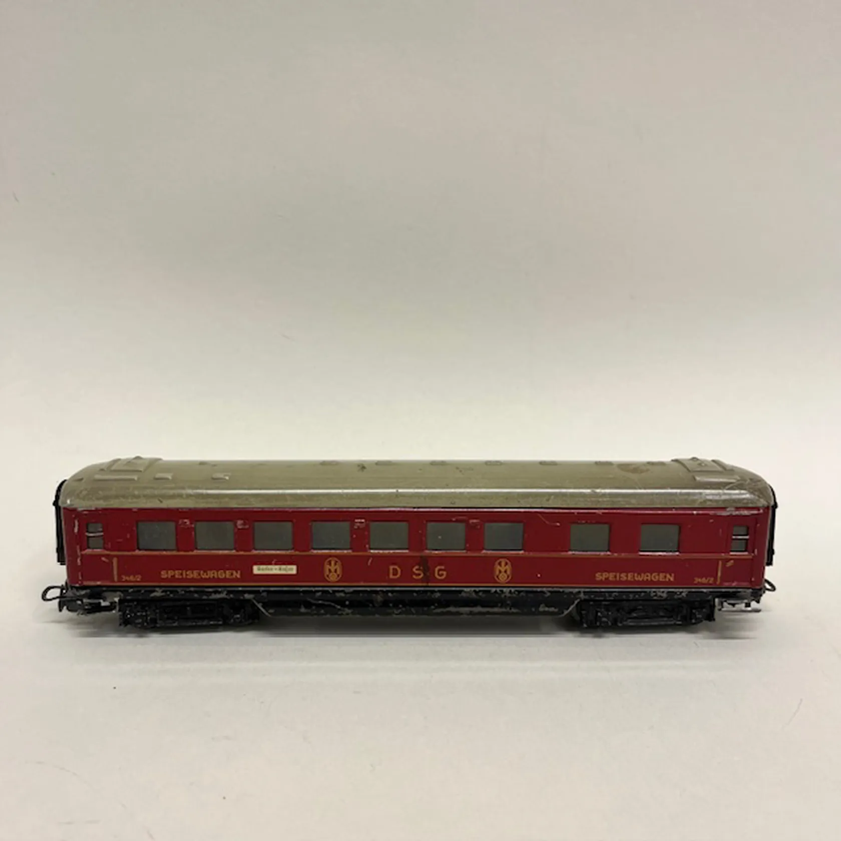 Restaurangvagn DSG 346/2, röd, Märklin, Tyskland, längd 21cm, repor, färgbortfall, inga tillbehör