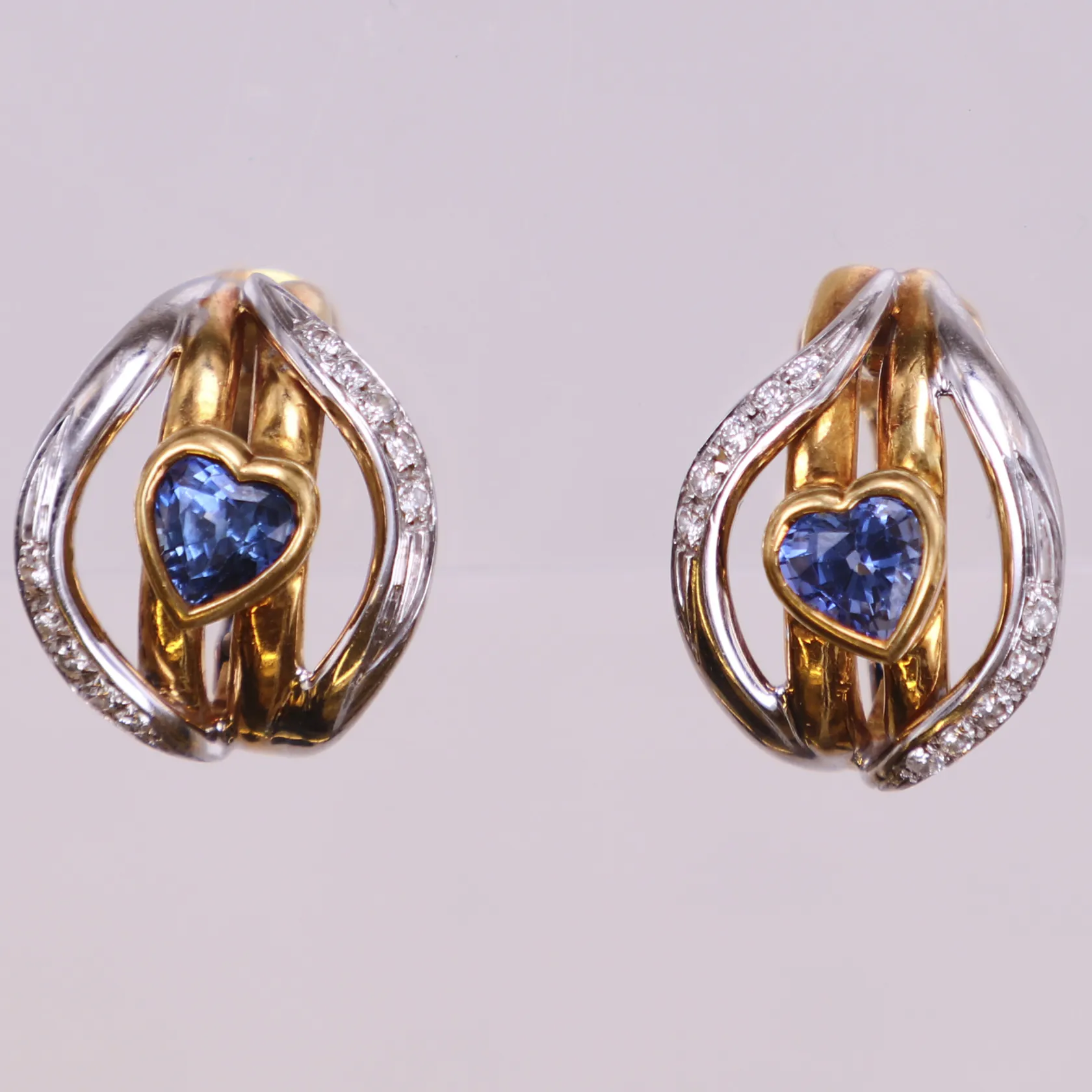 Ett par örhängen med hjärtslipade blå stenar och diamanter 20xca0,01ct, längd 17,7mm, bredd 13,5mm, tvåfärgade, 18K Vikt: 8,1 g.