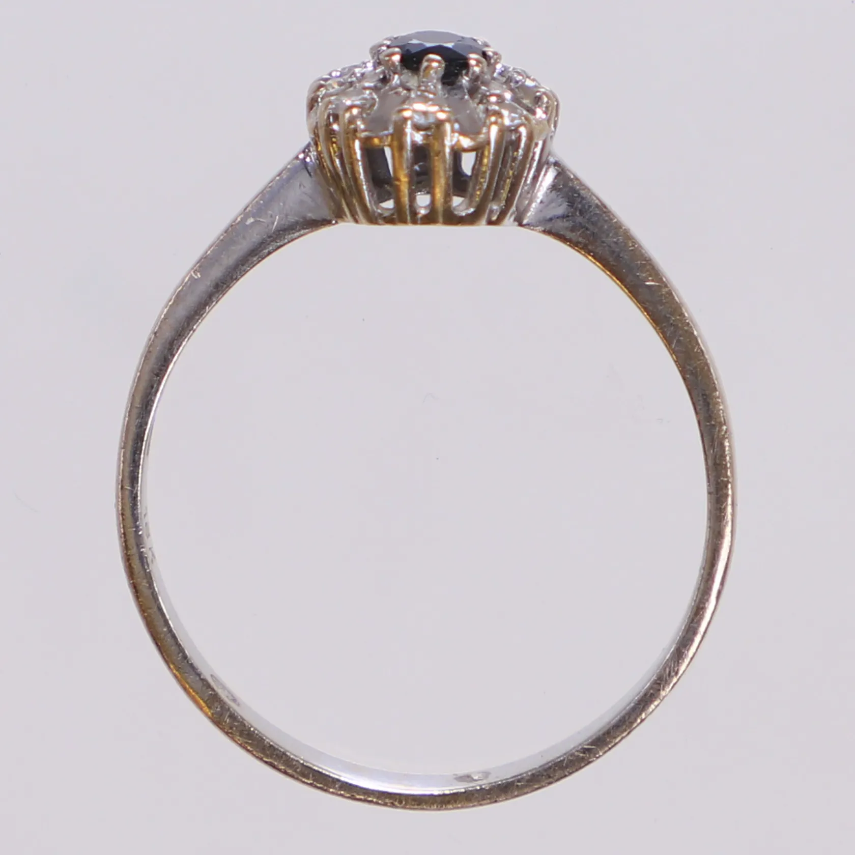 Carmoséring med safir, åttkantslipade diamanter ca 0,08ctv, stl 17½, bredd 8,6mm, behov av omrodiering, repor, vitguld 18K Vikt: 2,2 g.