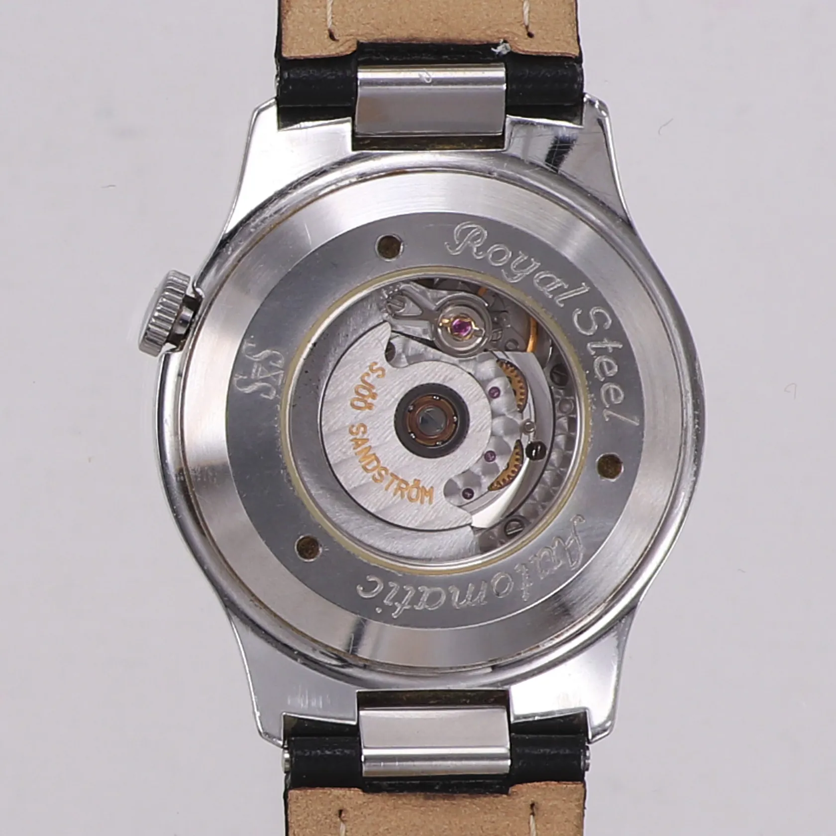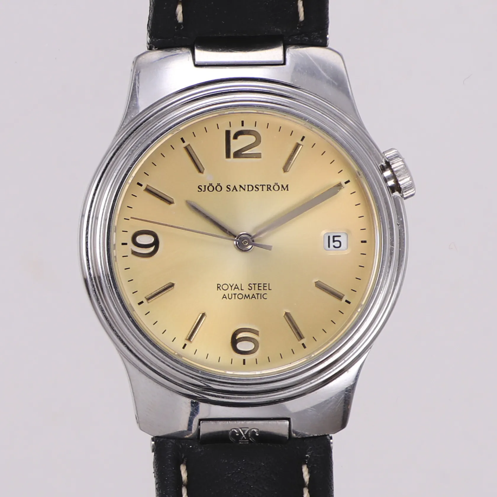 Herrur, Sjöö Sandström Royal Steel, stål, 37mm, automatisk, datum (återställer ej korrekt), urtavla något missfärgad, 1990-tal, svart läderband, box, inga övriga tillbehör