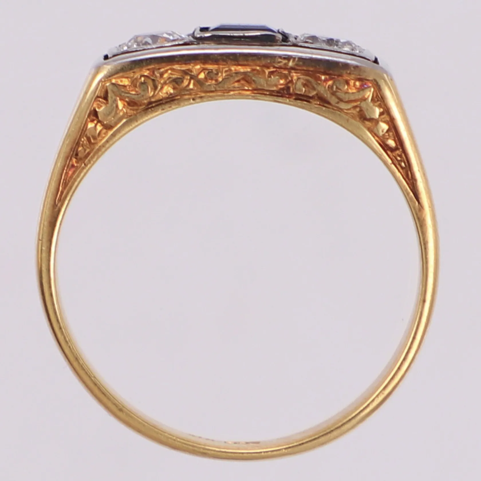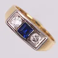 Ring med gammalslipade diamanter 2 x ca 0,20ct, (P), samt blå sten, slitage, stl 18¾, 6,9mm, 18K Vikt: 6,6 g.
