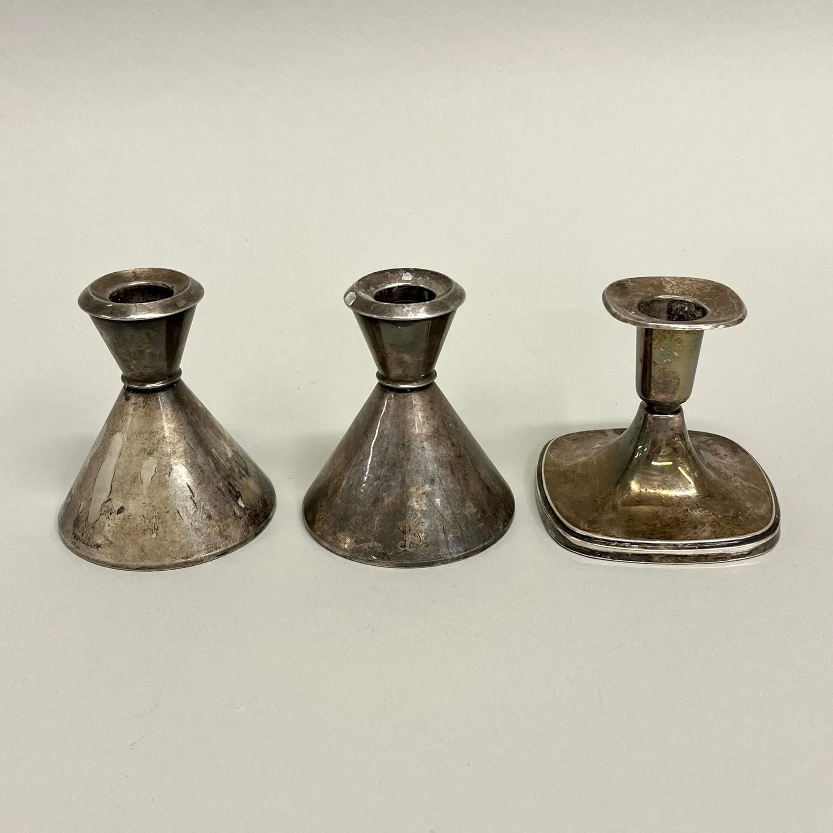 3 Ljusstakar, höjd 8-9cm, en med bucklor, två med gravyr, två med botten i metall, silver 830/1000 Vikt: 188 g.
