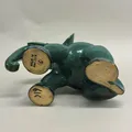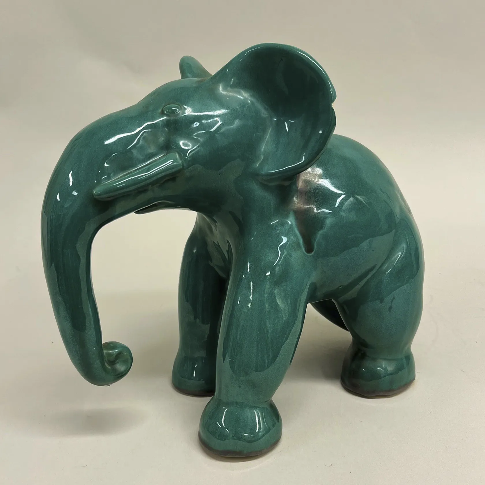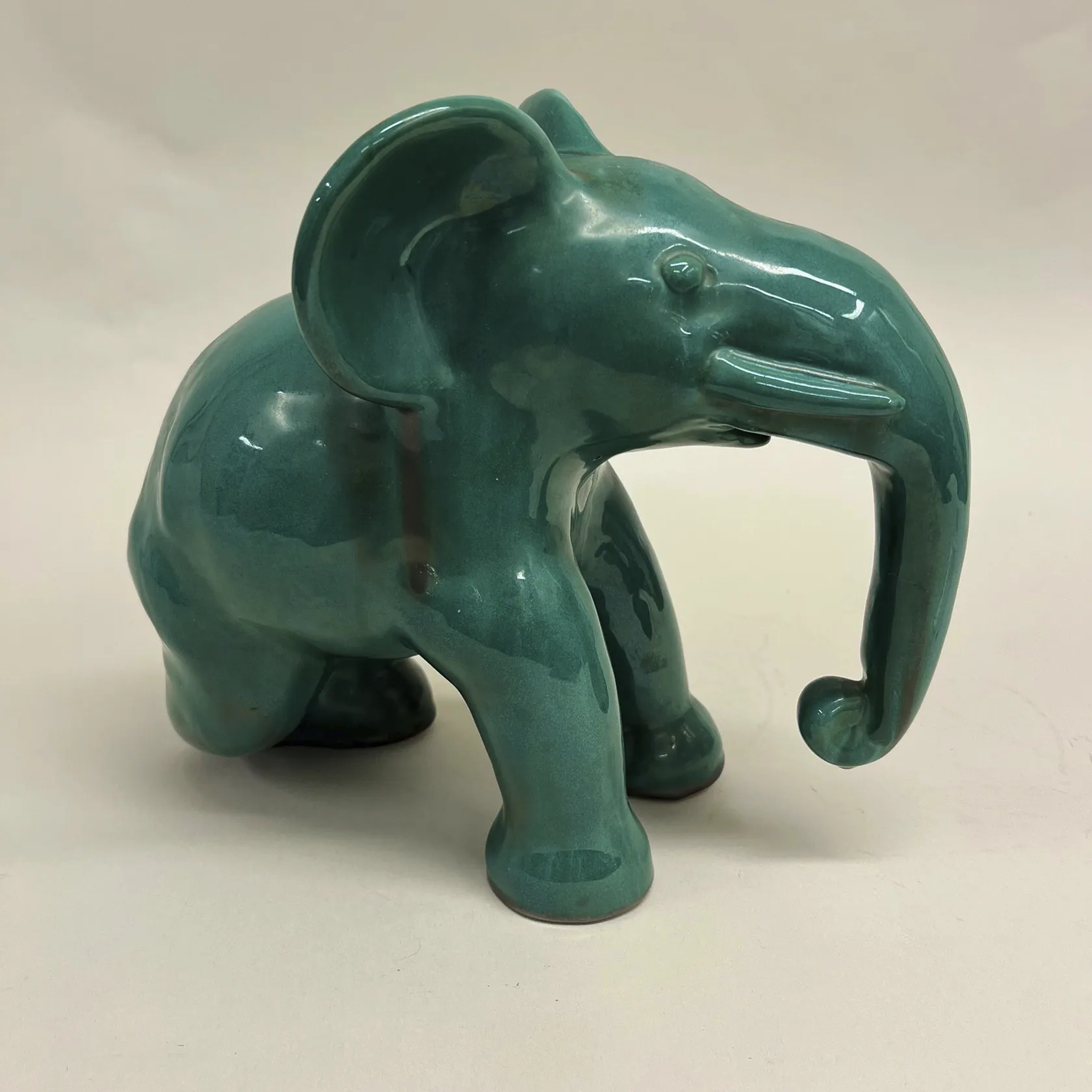 Skulptur, elefant, höjd 26cm, längd 30cm, Allan Ebeling, stämplad Uppsala-Ekeby, Made in Sweden, i tillverkning 1929-1938, grönglaserat lergods, skev, nagg/skada på öra, litet nagg på fot Skickas med postpaket.
