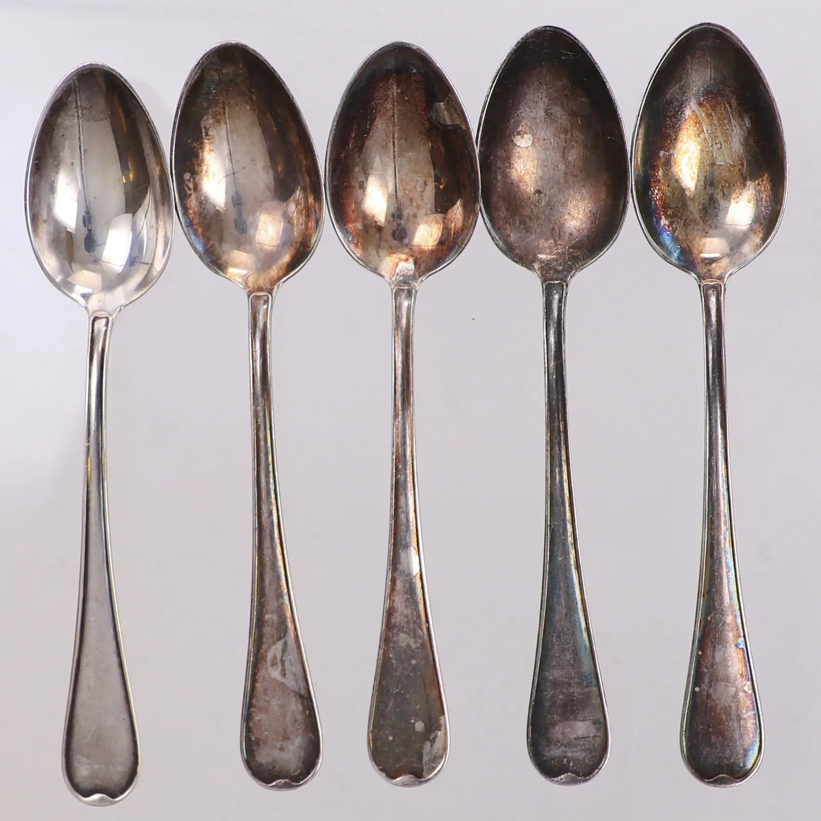 5 mockaskedar, längd 10,5cm, modell Svensk rund, GAB, 830/1000 silver Vikt: 46,2 g.