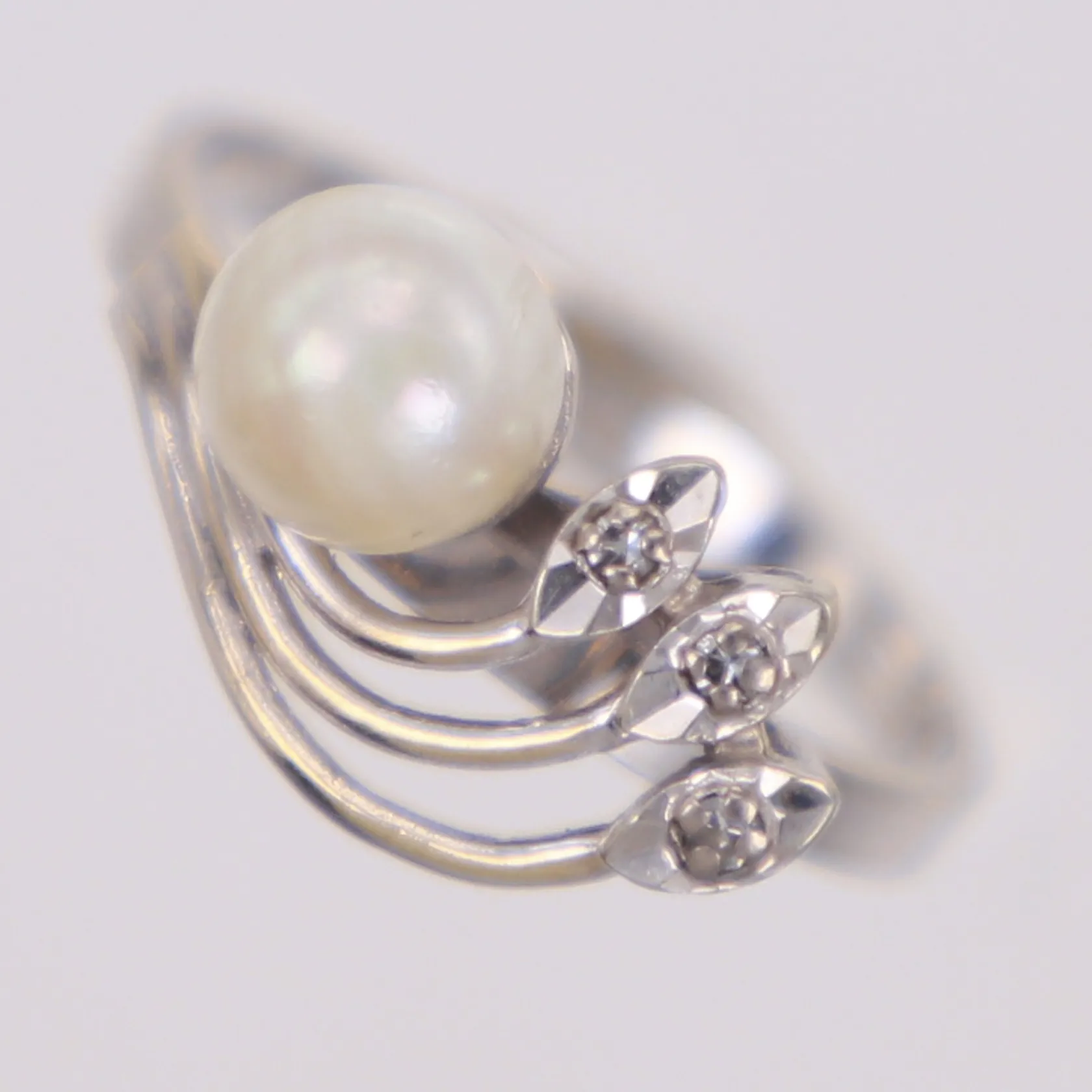 Ring med åttkantslipade diamanter ca 0,03ctv och odlad pärla Ø6mm, stl 16¼, bredd 1,9-9mm, vitguld, 18K Vikt: 2,5 g.