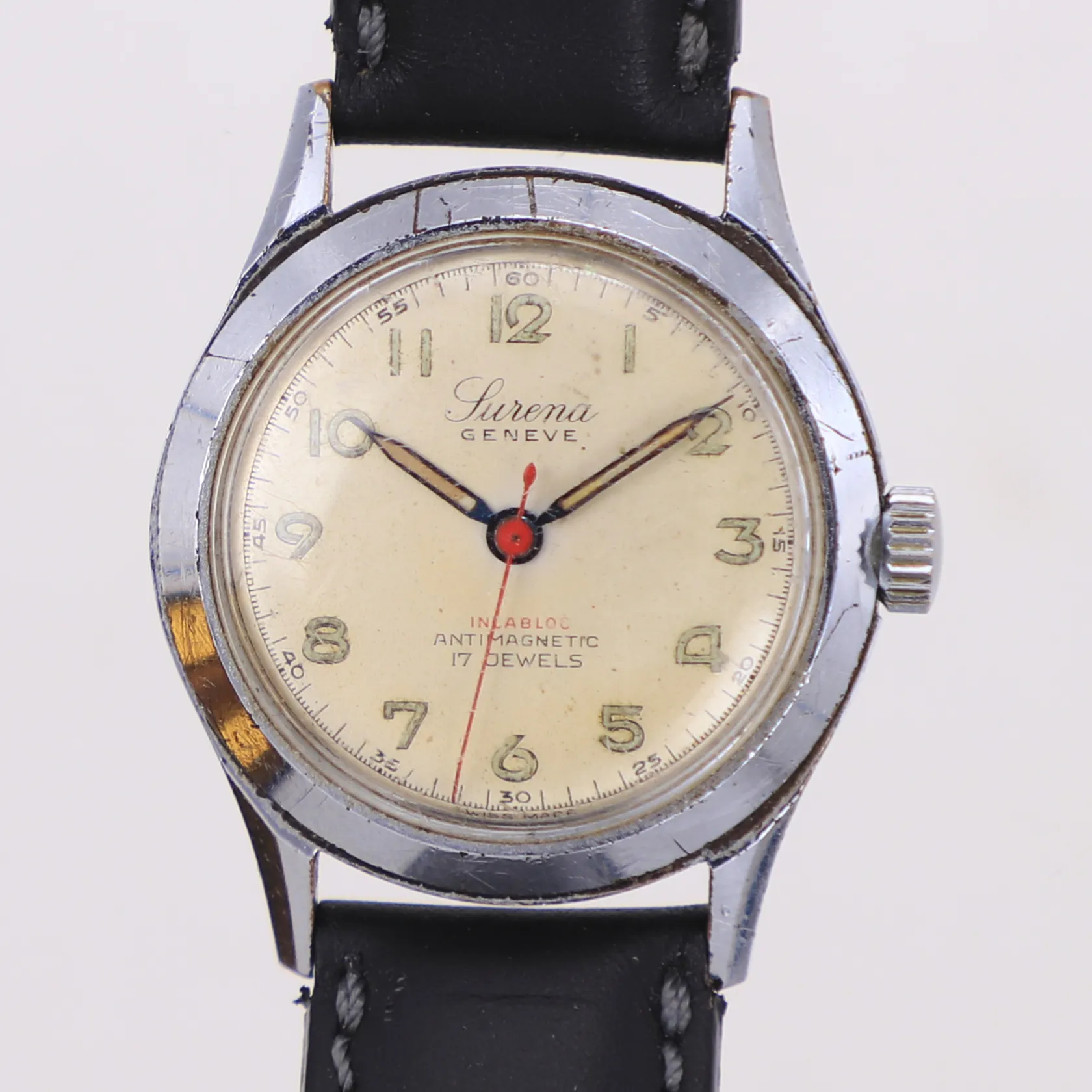 Herrur, Surena géneve, 32mm, stål, manuell, läderband ej original, inga tillbehör.