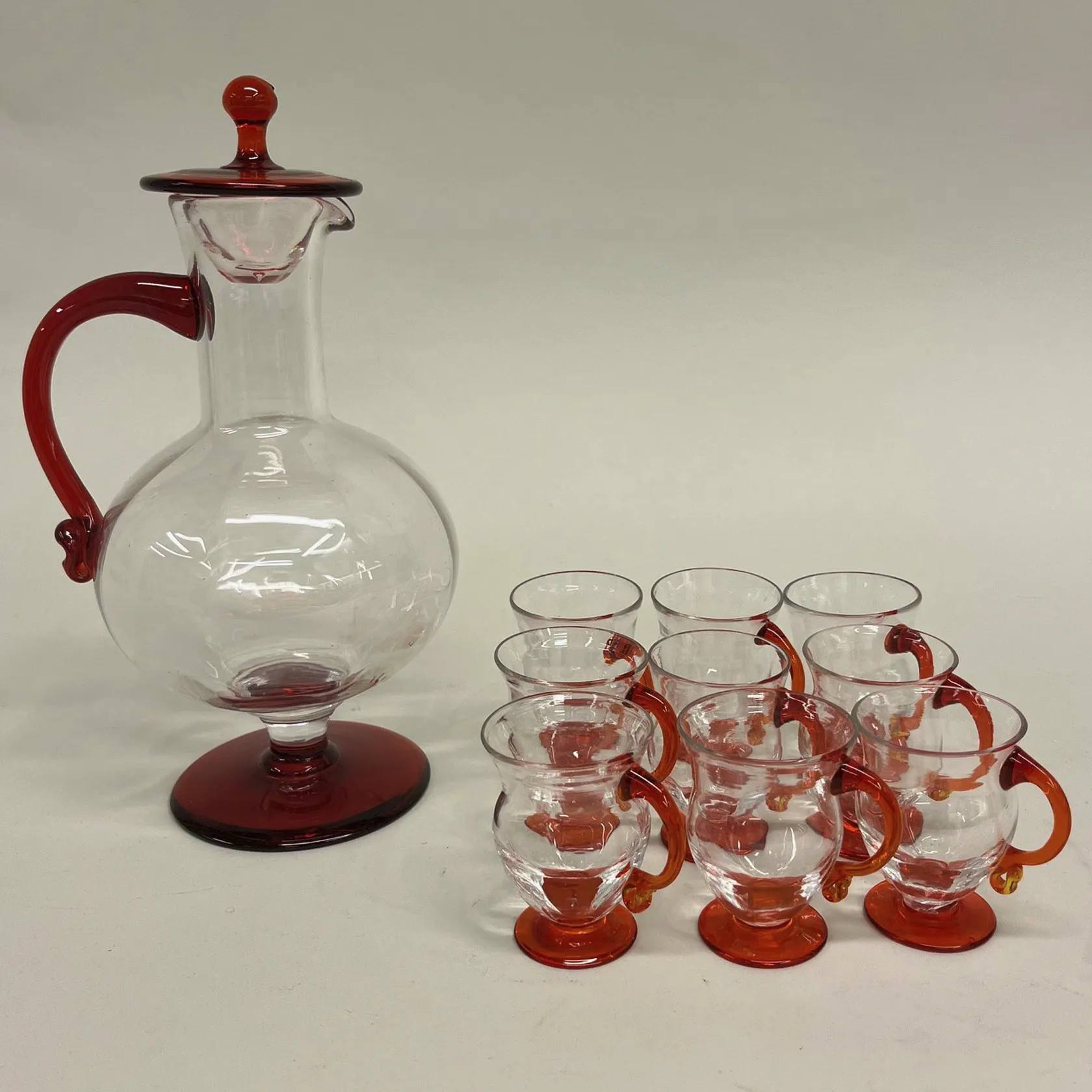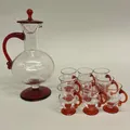 Glöggservis, nio glas, höjd 7 cm, Kanna med lock, höjd 26cm, William Stenberg, Gullaskruf, rött/klarglas, tre glas med nagg Skickas med postpaket.