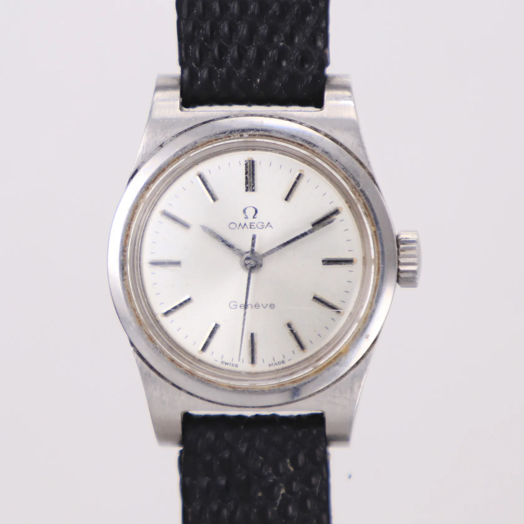 Damur, Omega Geneve, stål, 26mm, manuell, plexiglas med repor, svart läderband ej original, box troligen ej original med slitage