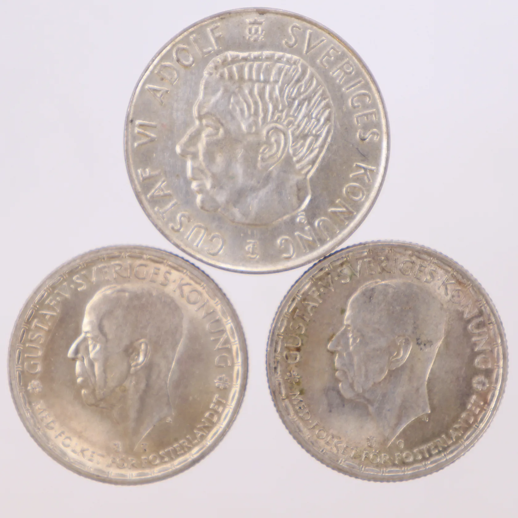 1 Mynt, 5-kr, Ø34mm, Gustaf VI Adolf Sveriges Konung, 5kr, 1954, 2 Mynt, 2-kr, Ø30mm, Gustaf V Sveriges Konung, med folket för fosterlandet, 1945-46, 400/1000 silver Vikt: 45,9 g.