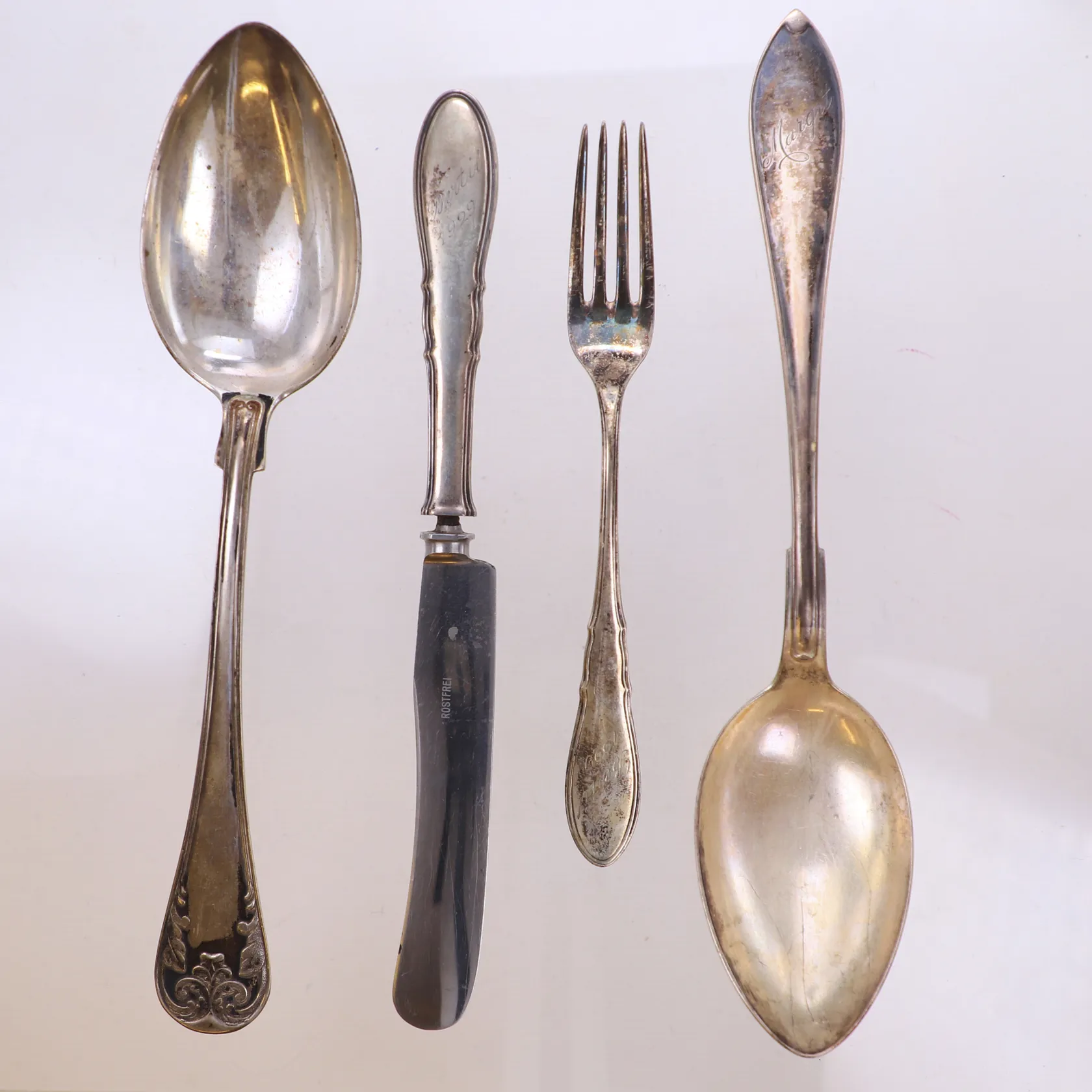2 skedar, 1 gaffel, 1 kniv med rostfritt blad, defekt/gravyr. Bruttovikt 183,1g Vikt: 183 g.