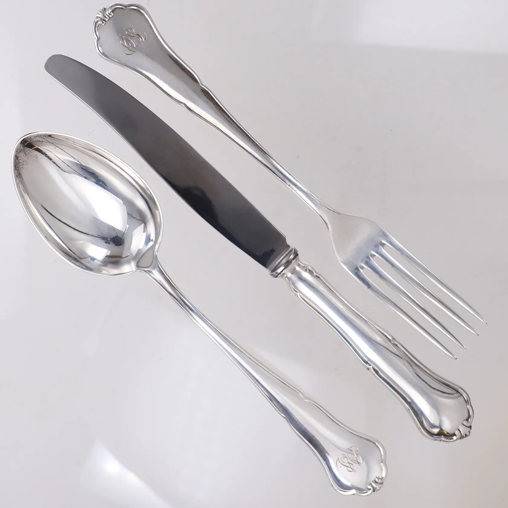 1 Matkniv, längd 24,5cm, rostfritt blad, 1 Matgaffel, längd 21,5cm, 1 Sked, längd 21,5cm, monogram, CGH, år 1946, 830/1000 silver. Bruttovikt 235,5g Vikt: 235,5 g.