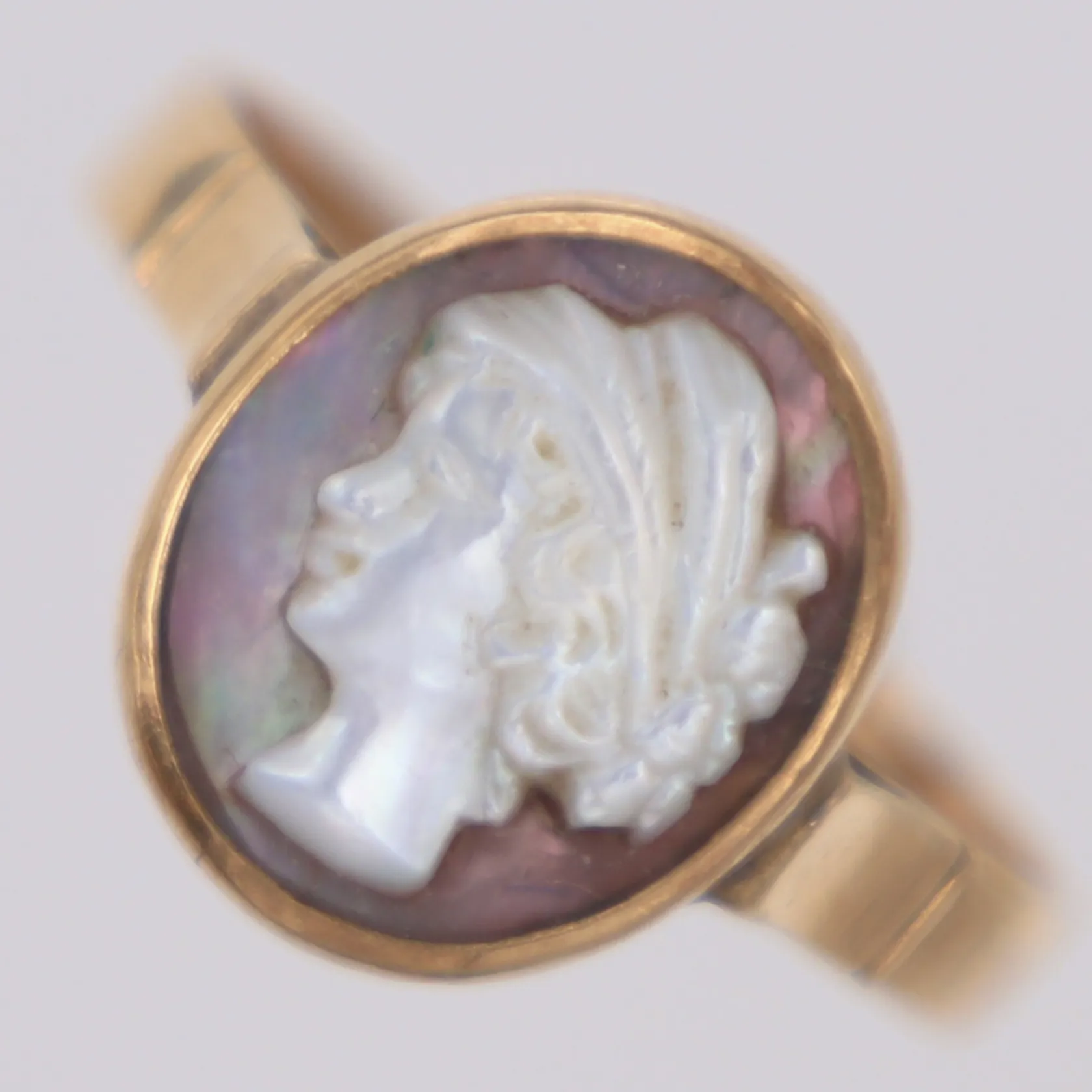 Ring med pärlemocamé, stl 17¾, bredd 12,9mm, 14K Vikt: 2,8 g.