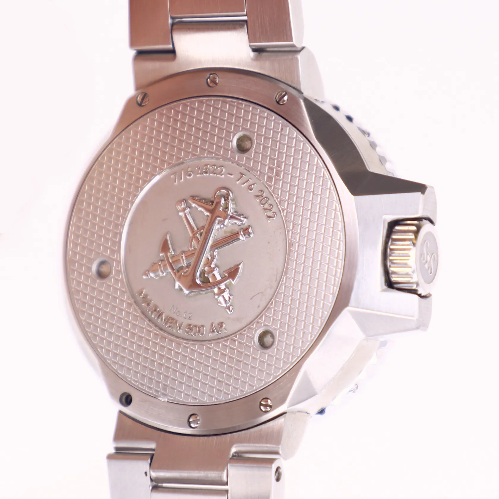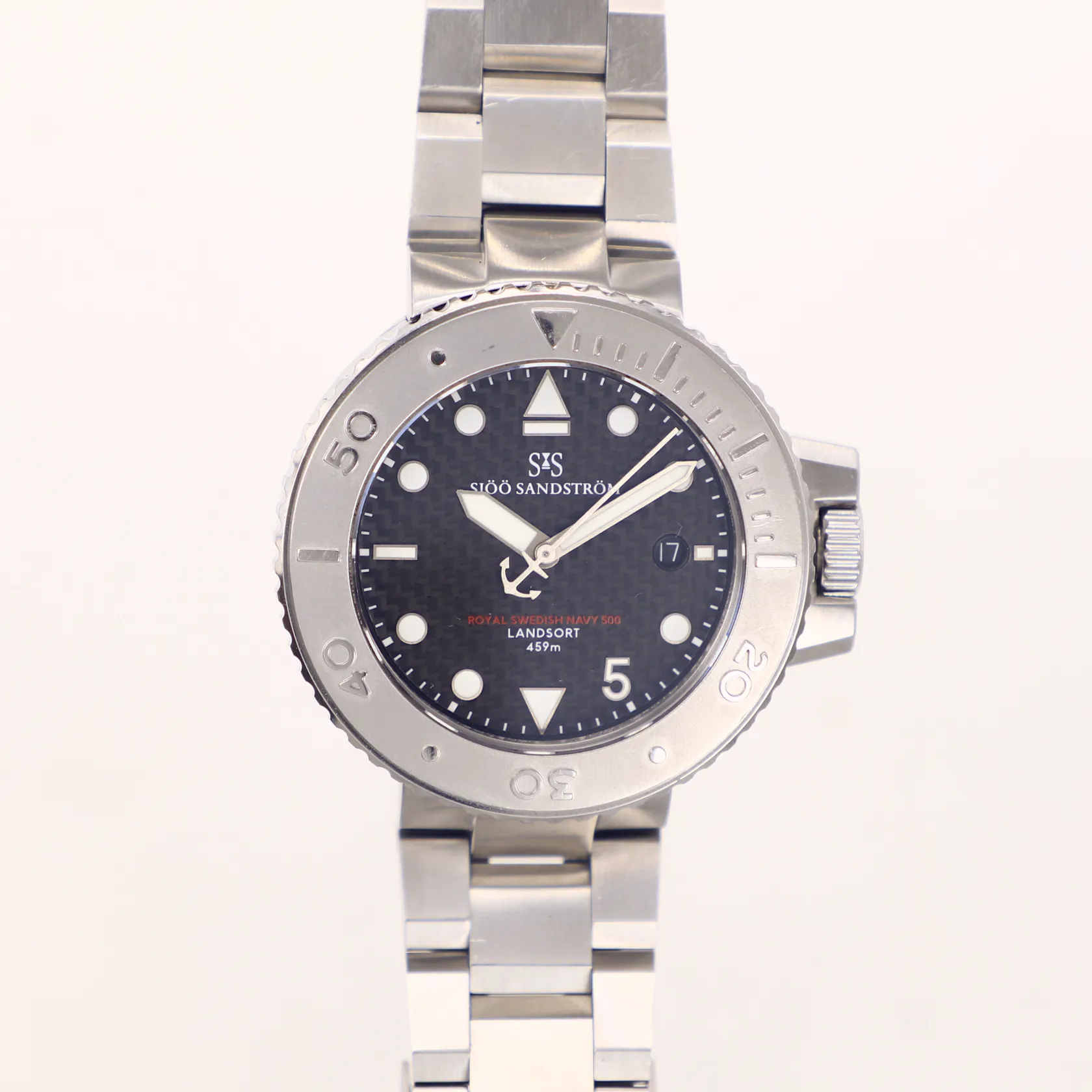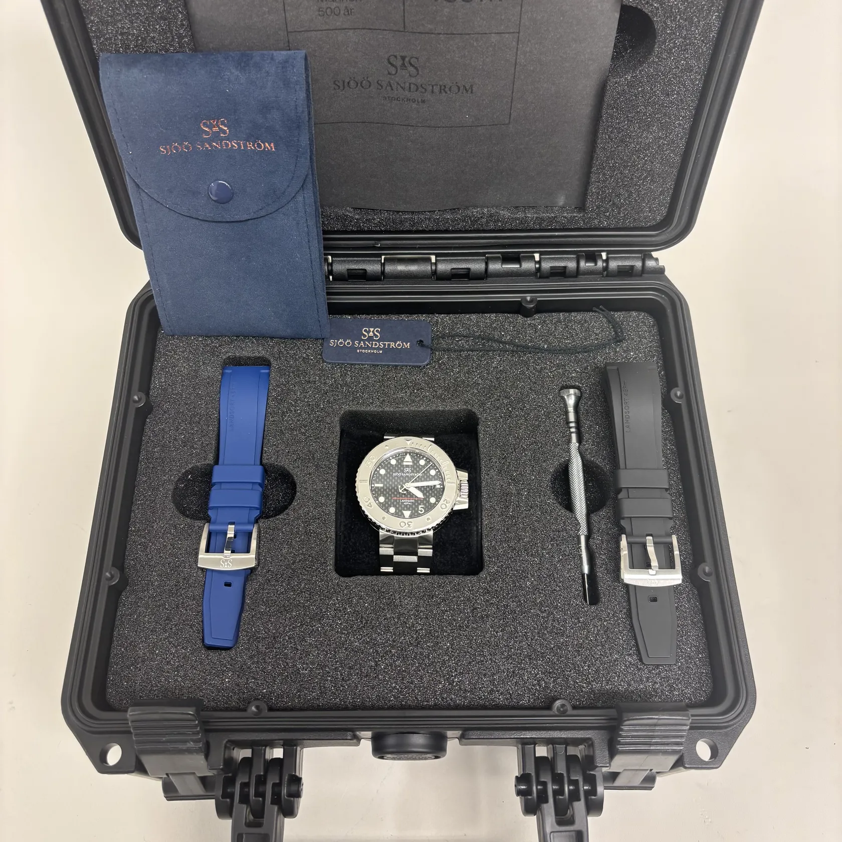 Herrur Sjöö Sandström, Landsort 459m, limiterad upplaga för marinens personal, Marinen 500 år, serienr 12, tjocklek 13,95mm, Ø42,5mm, automatisk, Cal SS G15, urtavla i kolfiber, safirglas, stål, stållänk med viklås, lätta repor, två extra armband i svart och blått gummi, certifikat 2022-09-23, manual, tag, skruvmejsel, resefodral, originalbox/väska, vattentät sjösäck. Skickas med postpaket.