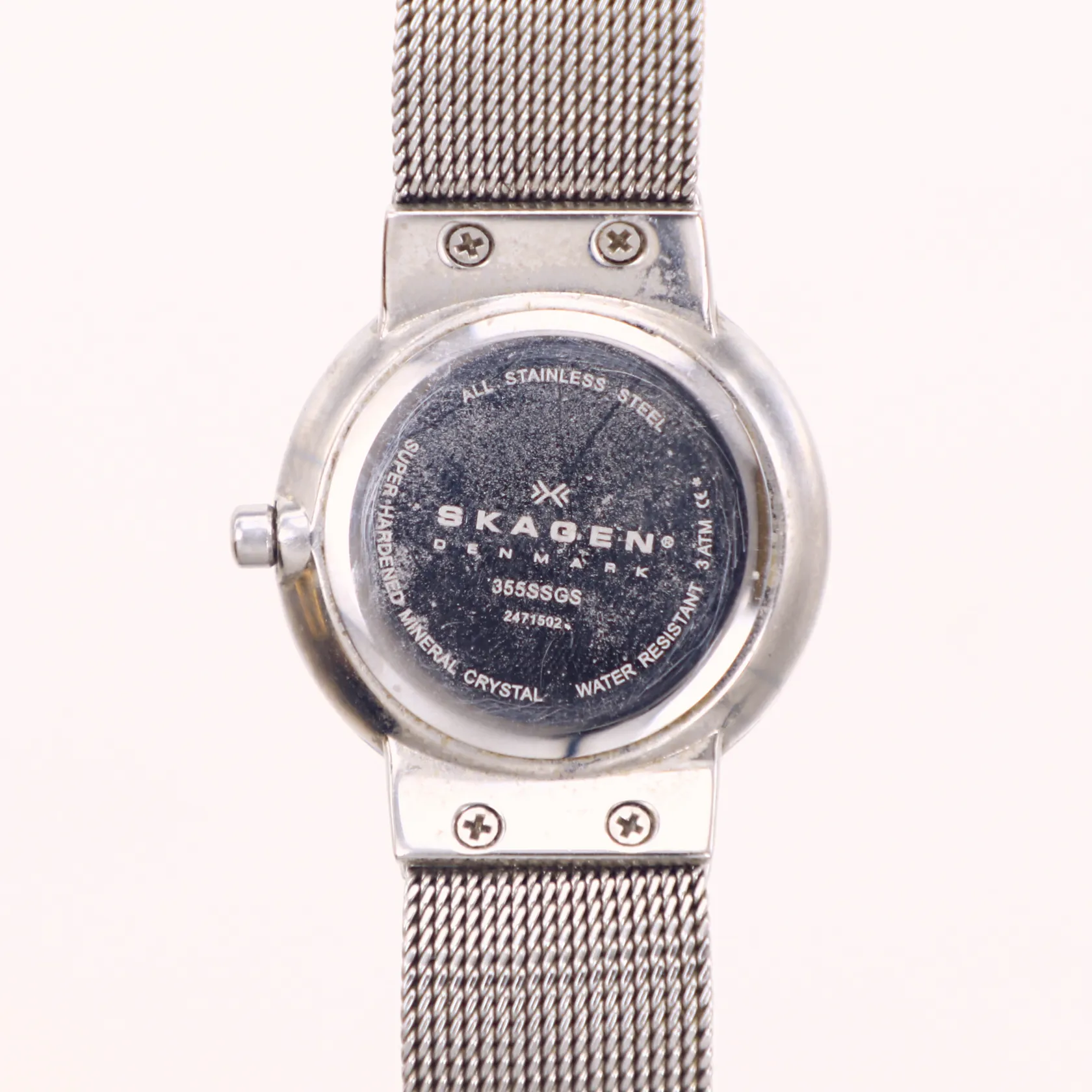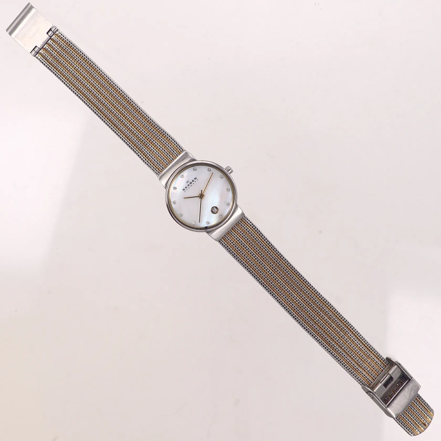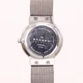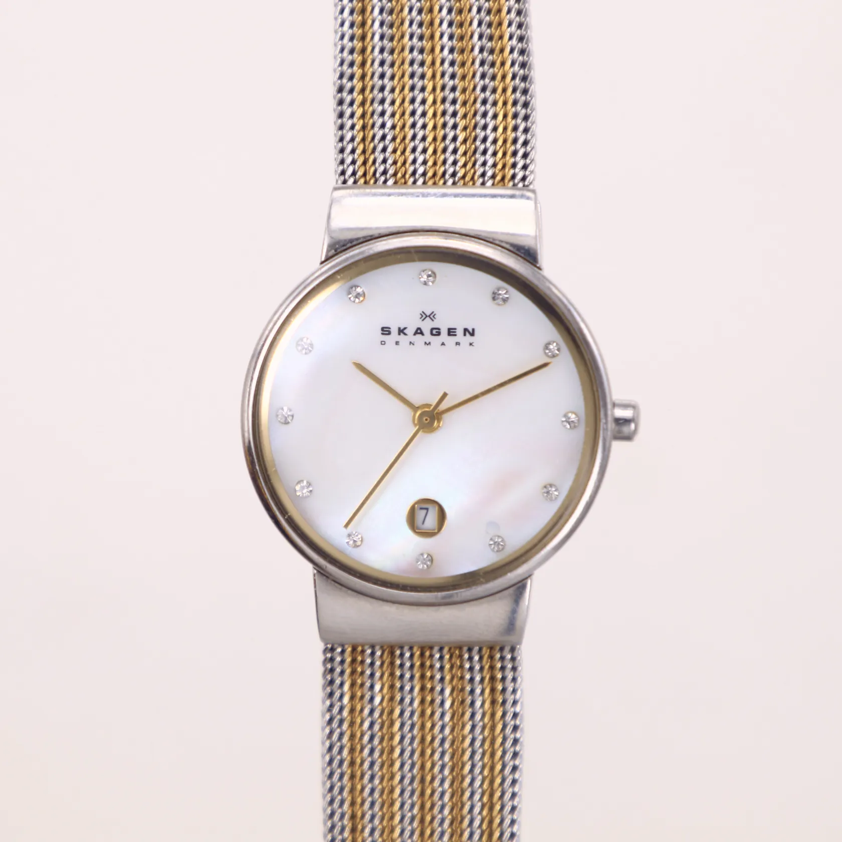 Damur, Skagen Ancher, Ø26mm, stål, quartz, modell 355SSGS, datum, urtavla i vit pärlemor med kristaller, mineralglas, meshlänk i flerfärgat stål