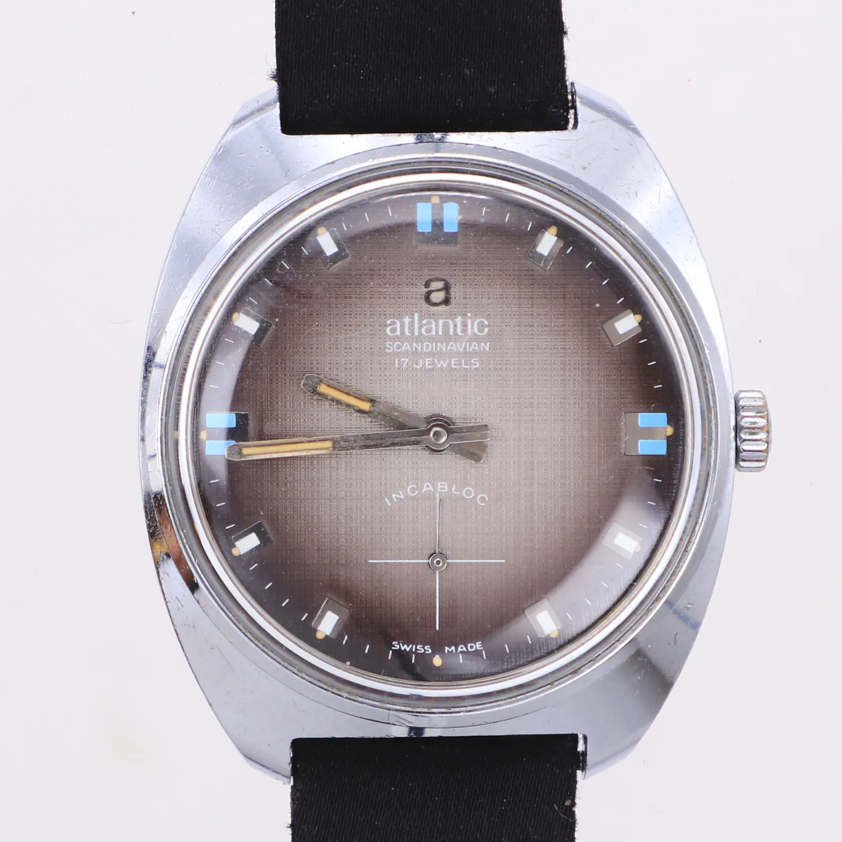 Armbandsur, Ø35,3mm, Atlantic, Scandinavian, 17 Jewels, Incabloc, #61503, stål, repor, svart tygband