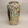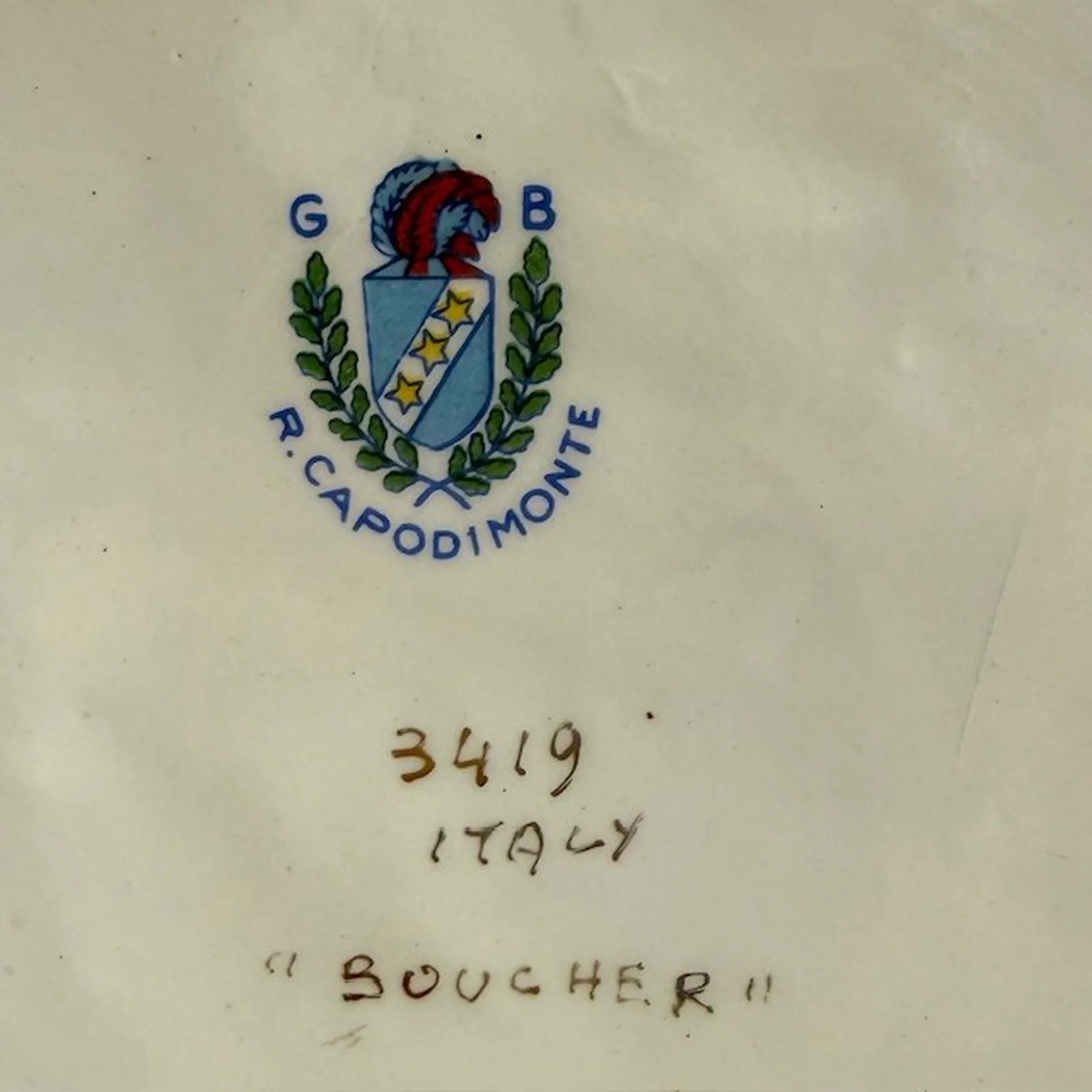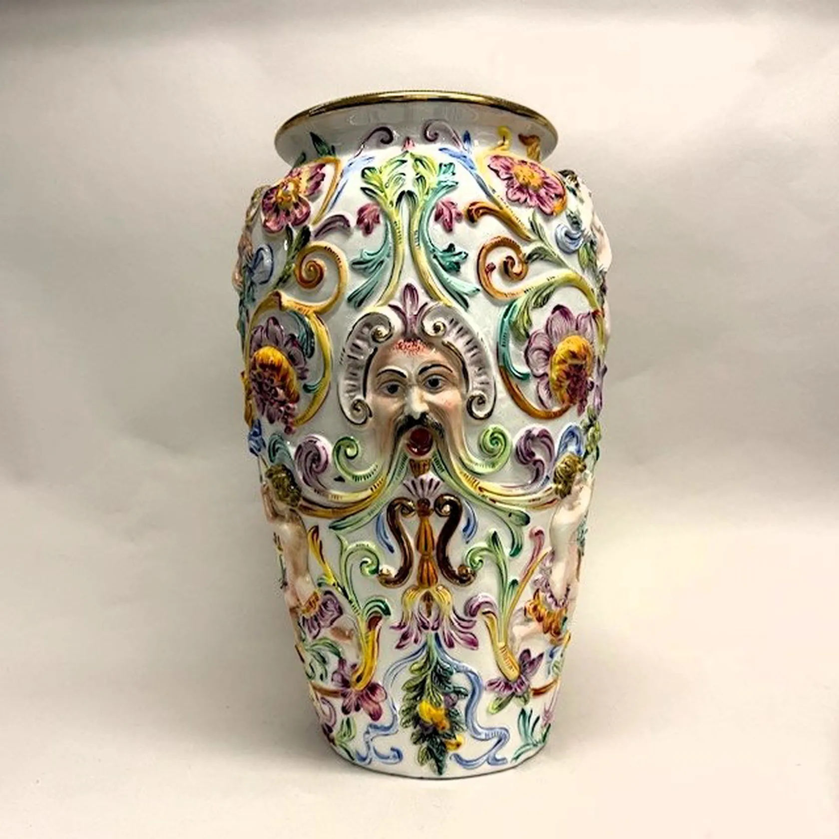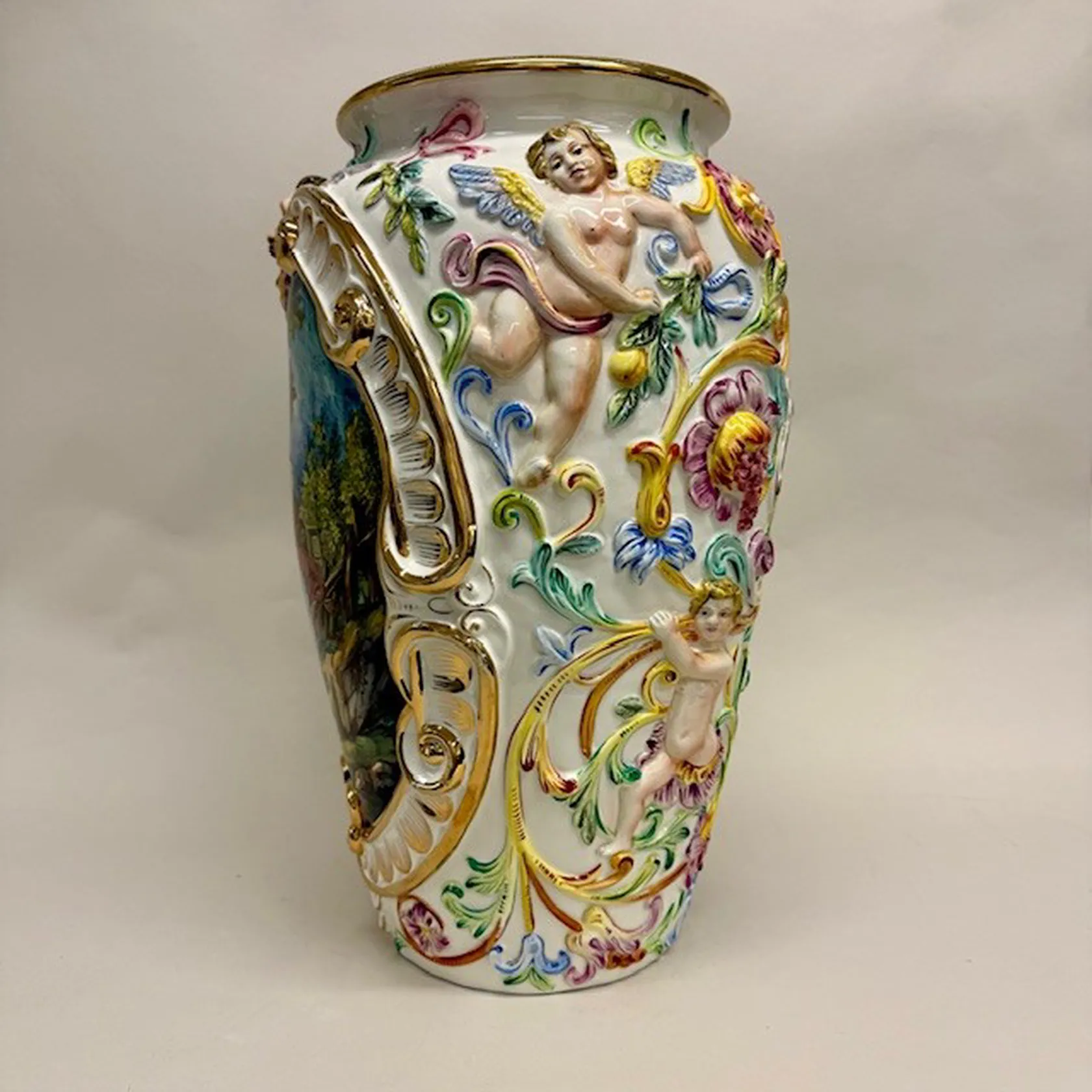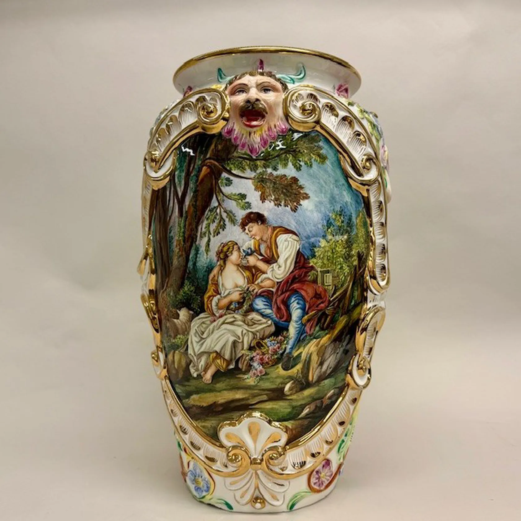 Urna med dekor av figurer i polykroma färger och guld, höjd 52cm, Boucher 3419 Italy, stämplad R. Capodimonte GB, nagg på fotring, lätta nagg i dekor. OBS. SKICKAS EJ! Skickas med postpaket.